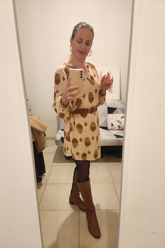 De stof is mooi maar kreukt snel. Eenmaal de riem aan, stijgt de jurk en is uiteindelijk vrij kort voor mijn 1,63 m." "