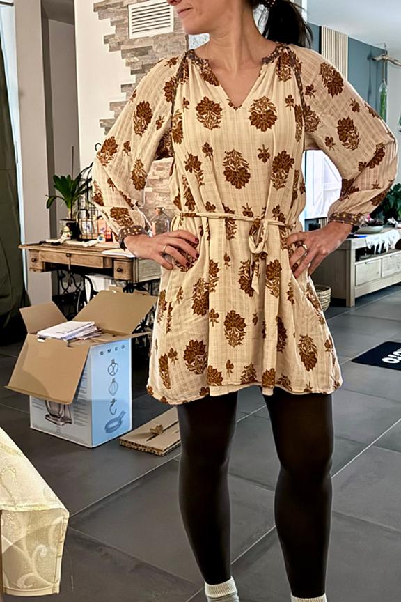 Voeg een bohemian flair toe aan je outfit met deze jurk, door hem te combineren met leren laarzen voor een elegante winterlook. • Korte jurk • Bloemenprint • Lange mouwen • V-hals • Riem (optioneel)