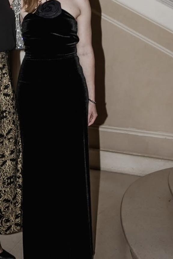 Combineer deze elegante jurk met metalen pumps en een glanzende clutch voor een glamoureuze avond. Perfect voor elke gelegenheid. • Lange jurk • Halternek • Split bij de benen • Aansluitende taille • Bloemdetail op de schouder