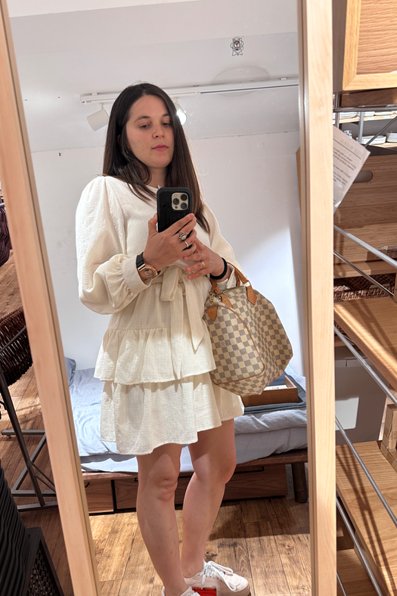 Flirt met de zomerbries in deze ecru jurk, perfect met gouden sandalen en een strooien hoed. Lichtheid en elegantie voor zonnige dagen. - Jurk met volants - Los, vloeiend model - Delicate afwerking met knopen - Getailleerde taille - Pofmouwen - Delicate knoopsluiting