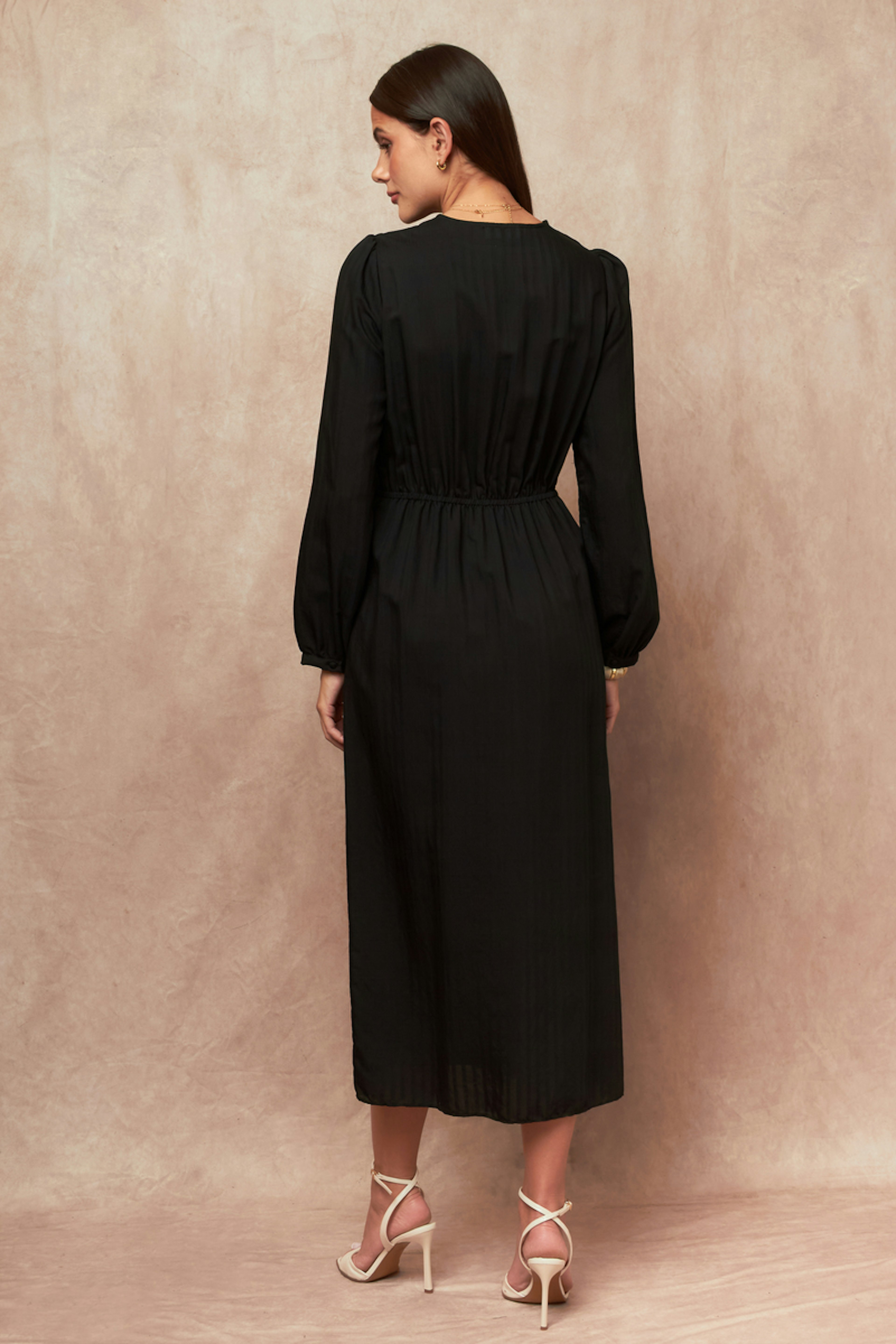 Combineer deze elegante jurk met nude pumps en een metallic clutch voor een chique accent. Perfect voor elke gelegenheid! • Vloeiende lange jurk • V-hals • Lange mouwen • Getailleerde taille • Elegante zijsplit