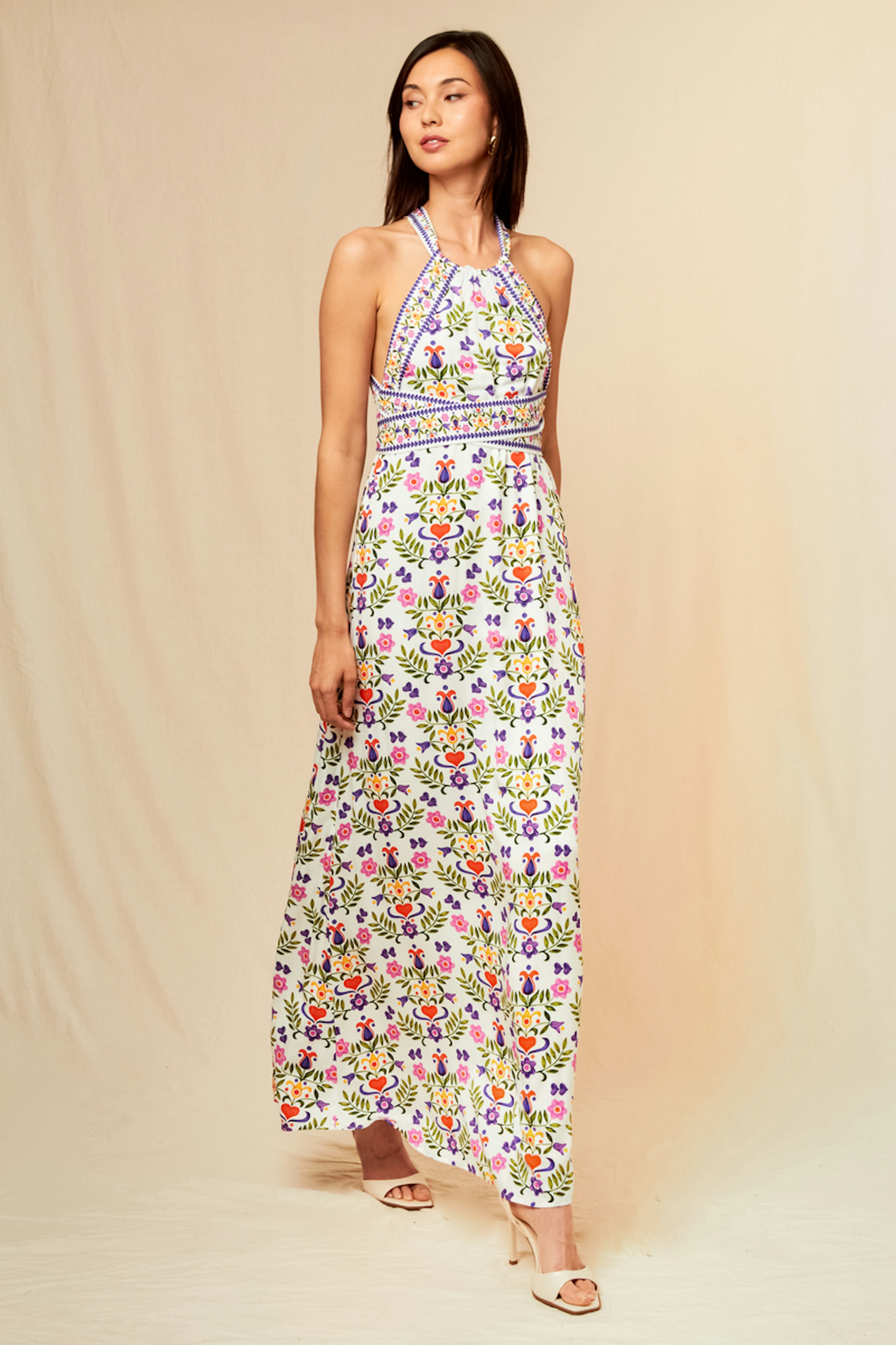 Draag deze jurk met gouden sandalen en oorbellen voor een chique zomerse look. - Bedrukte maxi-jurk - Halternek - Halter - Los silhouet - Levendige bloemmotieven
