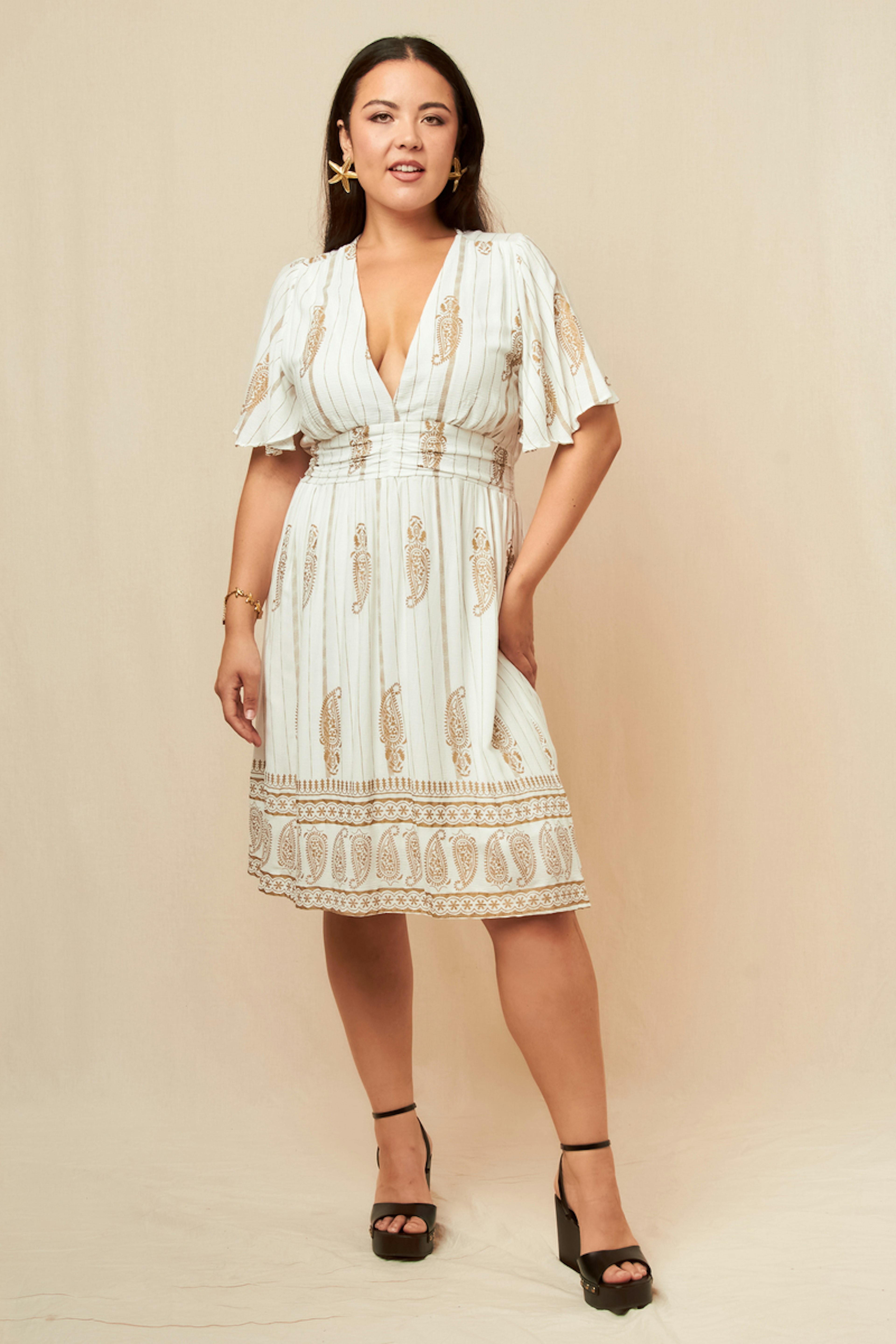Combineer deze jurk met gouden sandalen en een rieten tas voor een chique zomerse look! - Kort jurkje met print - V-halslijn - Korte uitlopende mouwen - Flatterende empire taille - Paisley patroon