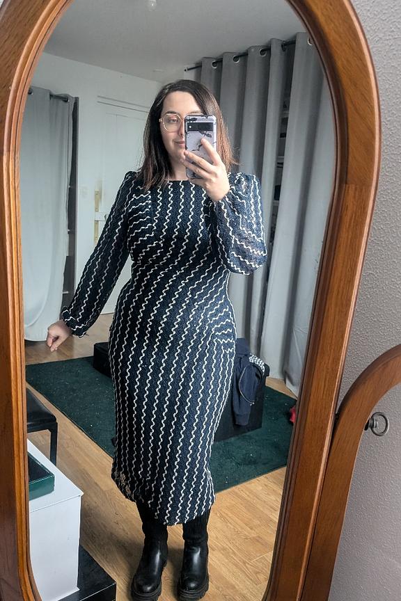 Combineer deze elegante jurk met leren enkellaarsjes en een zachte sjaal voor een chique winterlook. - Rechte jurk - Lange mouw - Ronde hals - Doorschijnende kanten stof - Zigzagpatroon