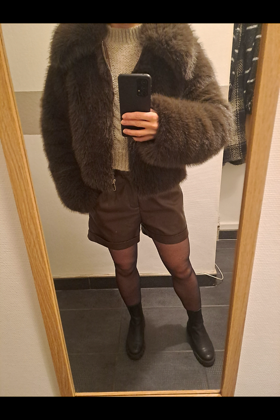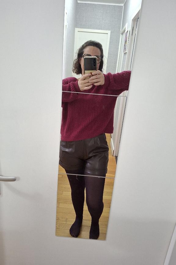 “Ik draag meestal broeken in maat M - L was hier de perfecte keuze. Ik heb ze leuk gevonden, behalve de vreemde geluiden die ze maken als je loopt. Heel schattig met een paar donkere semi-doorzichtige panty’s.”