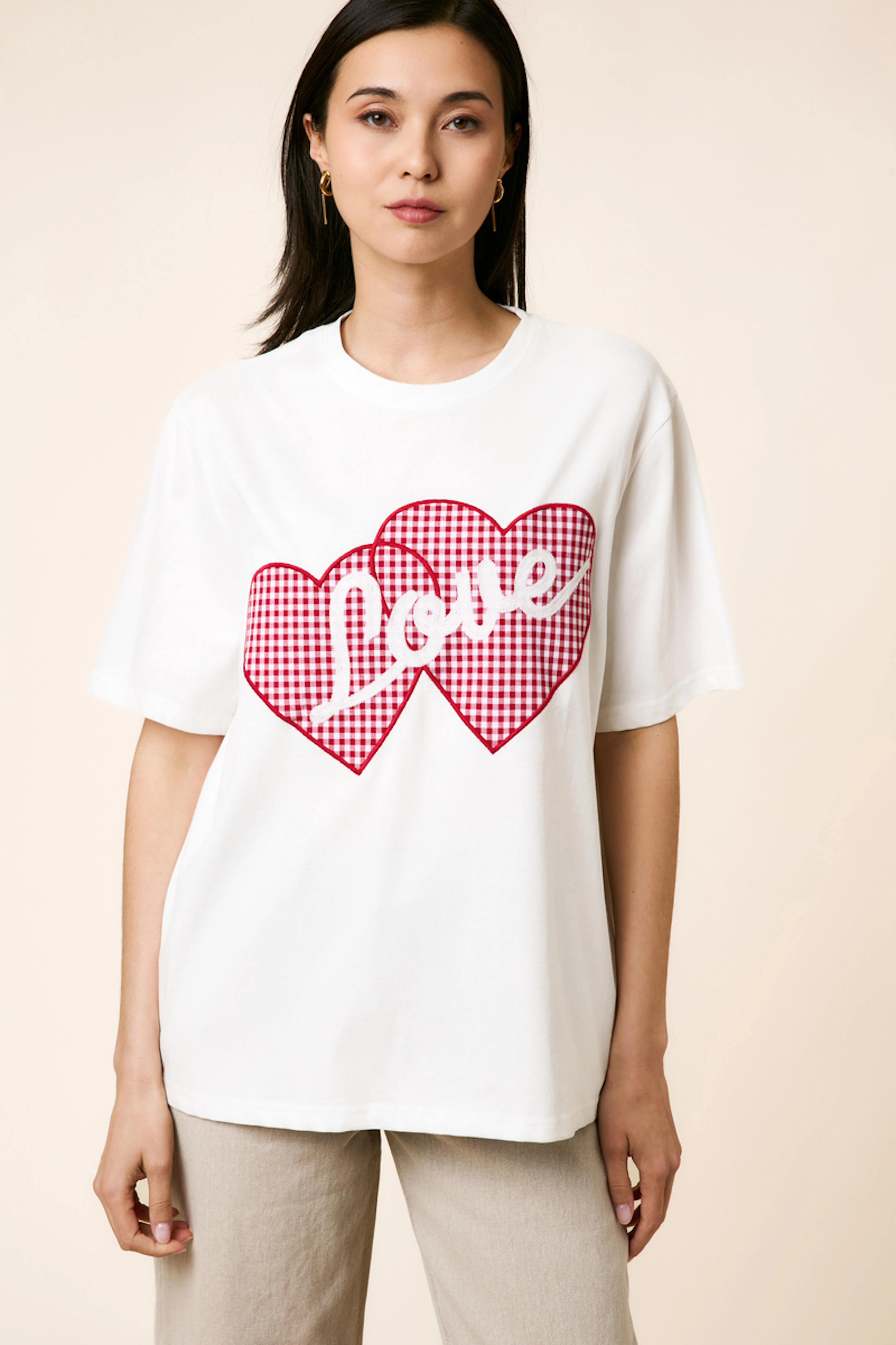 Combineer dit T-shirt met een hoge taille jeans en sneakers voor een casual look. Perfect voor een lichte zomerse stijl. • Katoenen t-shirt • Rechte pasvorm • Korte mouwen • Ronde hals • Hartpatroon