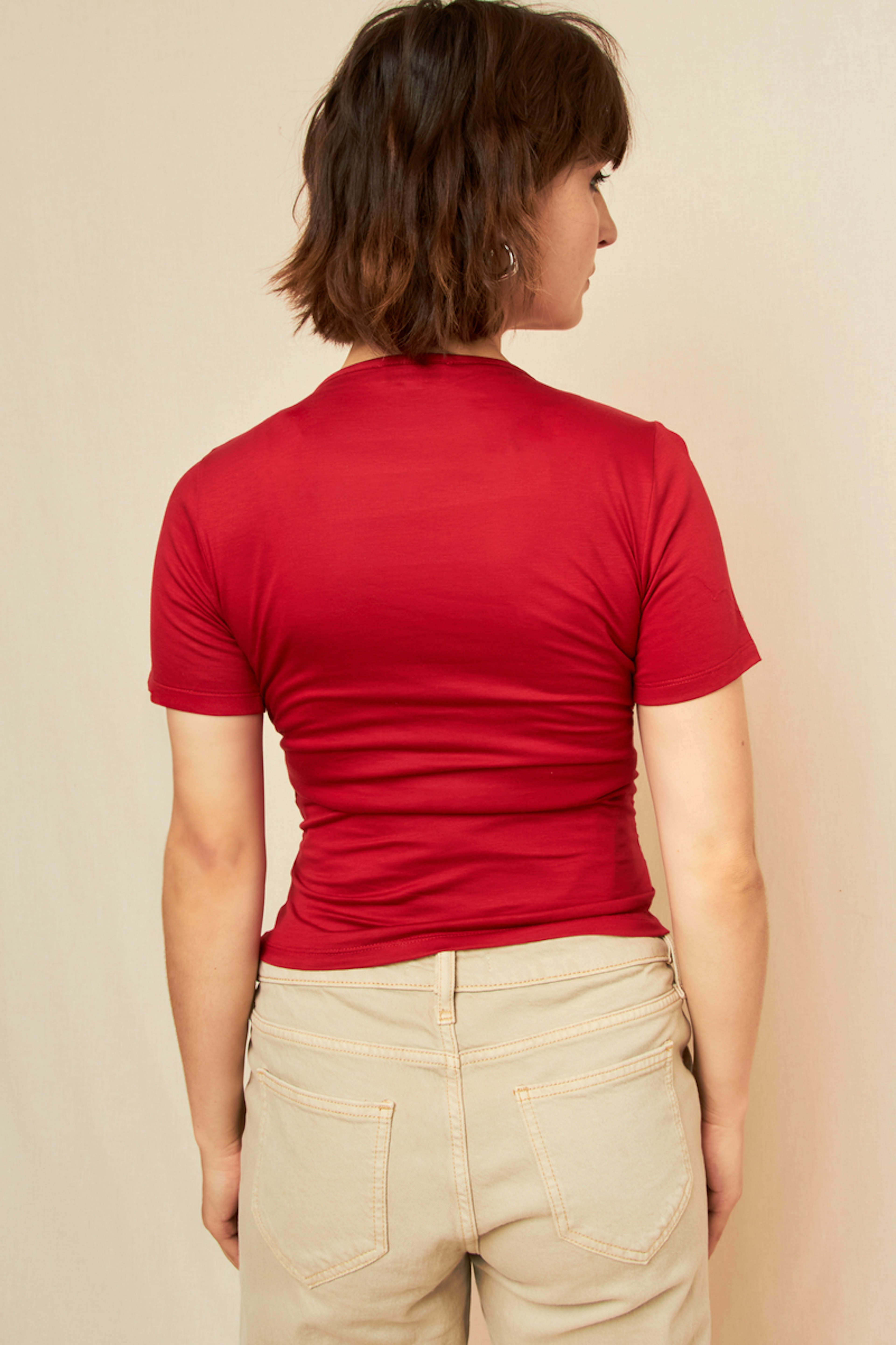 Combineer dit rode T-shirt met een broek met hoge taille en sandalen voor een frisse, zomerse look. - Katoenen T-shirt - Flatterende V-hals - Elegante korte mouwen - Rimpels aan de zijkant - Discrete opening voor borstvoeding