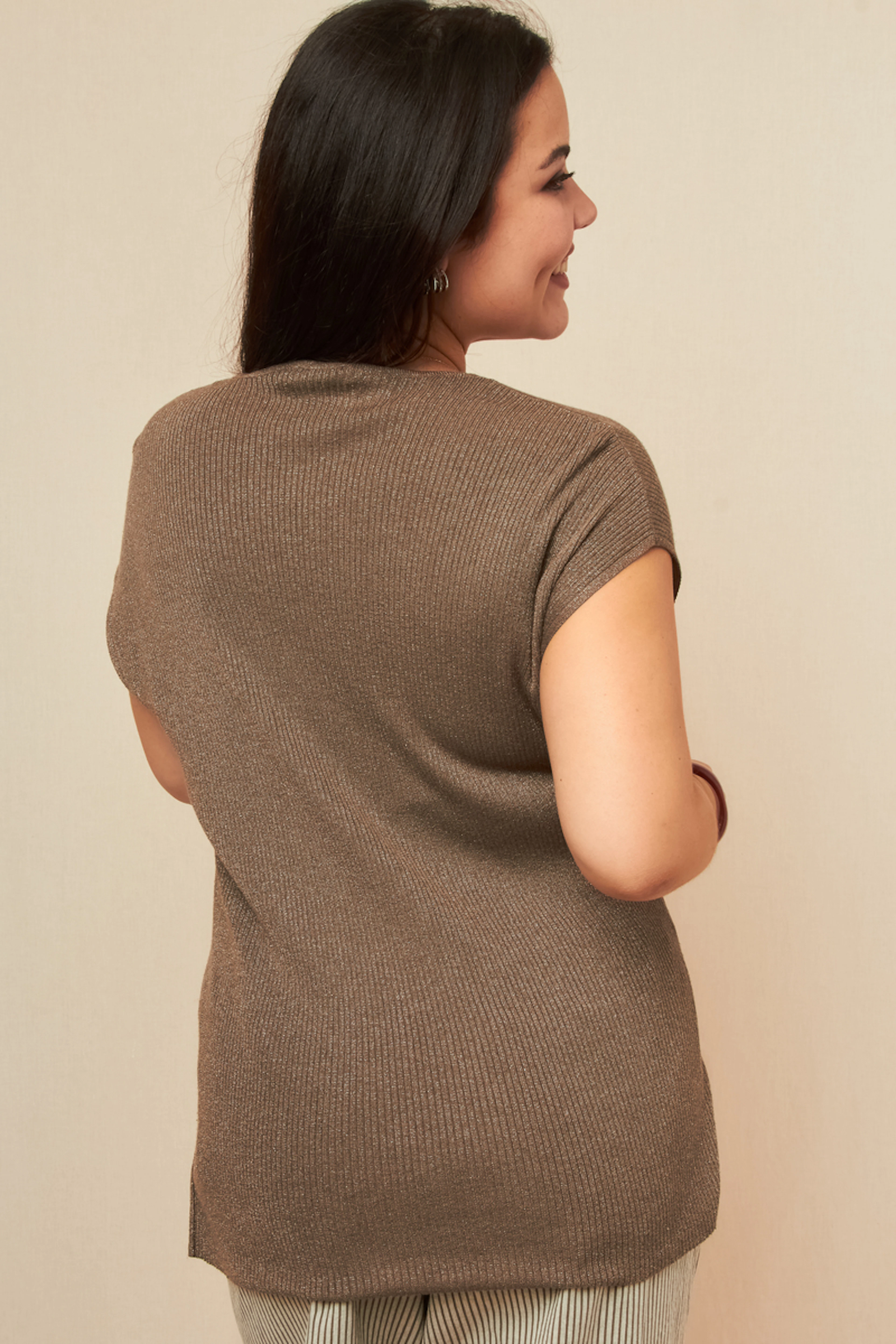 Combineer deze kaki trui met een donkere jeans en enkellaarsjes voor een chique winterlook. - T-shirt met V-hals en metallic vezels - Korte mouwen - Ongedwongen pasvorm - Metallic stof
