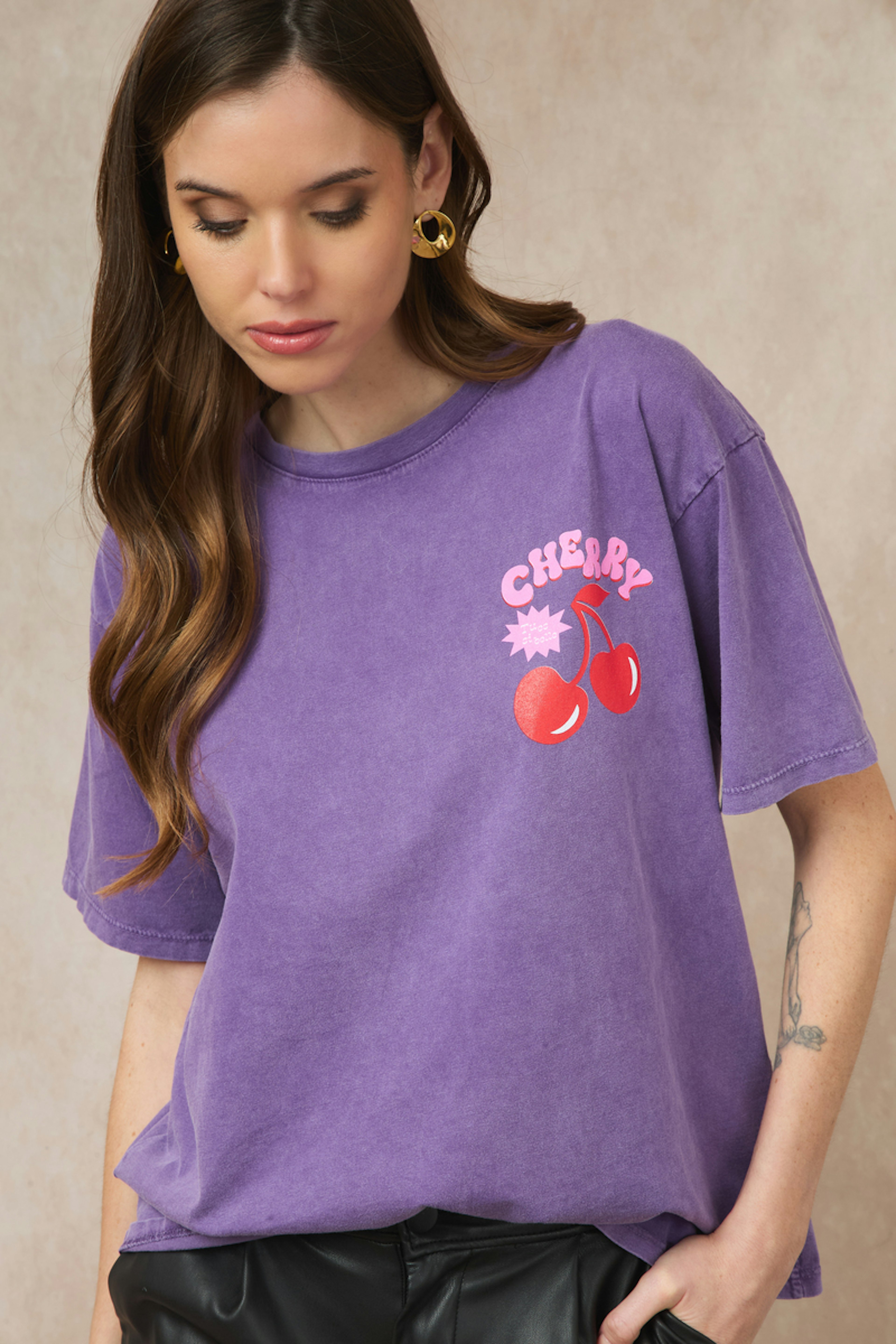 Combineer dit T-shirt met een zwarte jeans en witte gympen voor een casual-chique look, ideaal voor een avondje uit met vrienden. - Katoenen T-shirt - Casual pasvorm - Korte mouwen - Grafische print op achterkant - Levendige paarse kleur