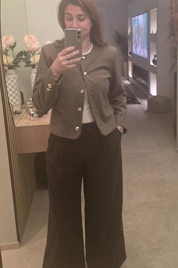 Combineer deze jas met een coltrui en een straight leg jeans voor een verfijnde winterlook. • Houndstooth motief jas • Elegante getailleerde pasvorm • Sluiting met gouden knopen • Gestructureerde lange mouwen • Sophisticated ronde hals