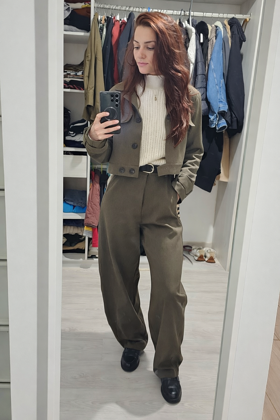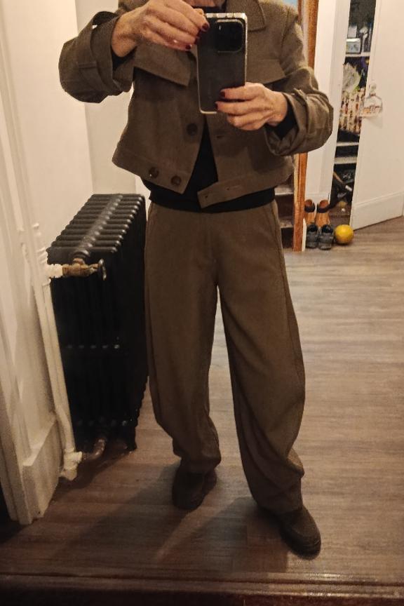 Mooie jas, vooral als je die draagt met de bijpassende broek" "