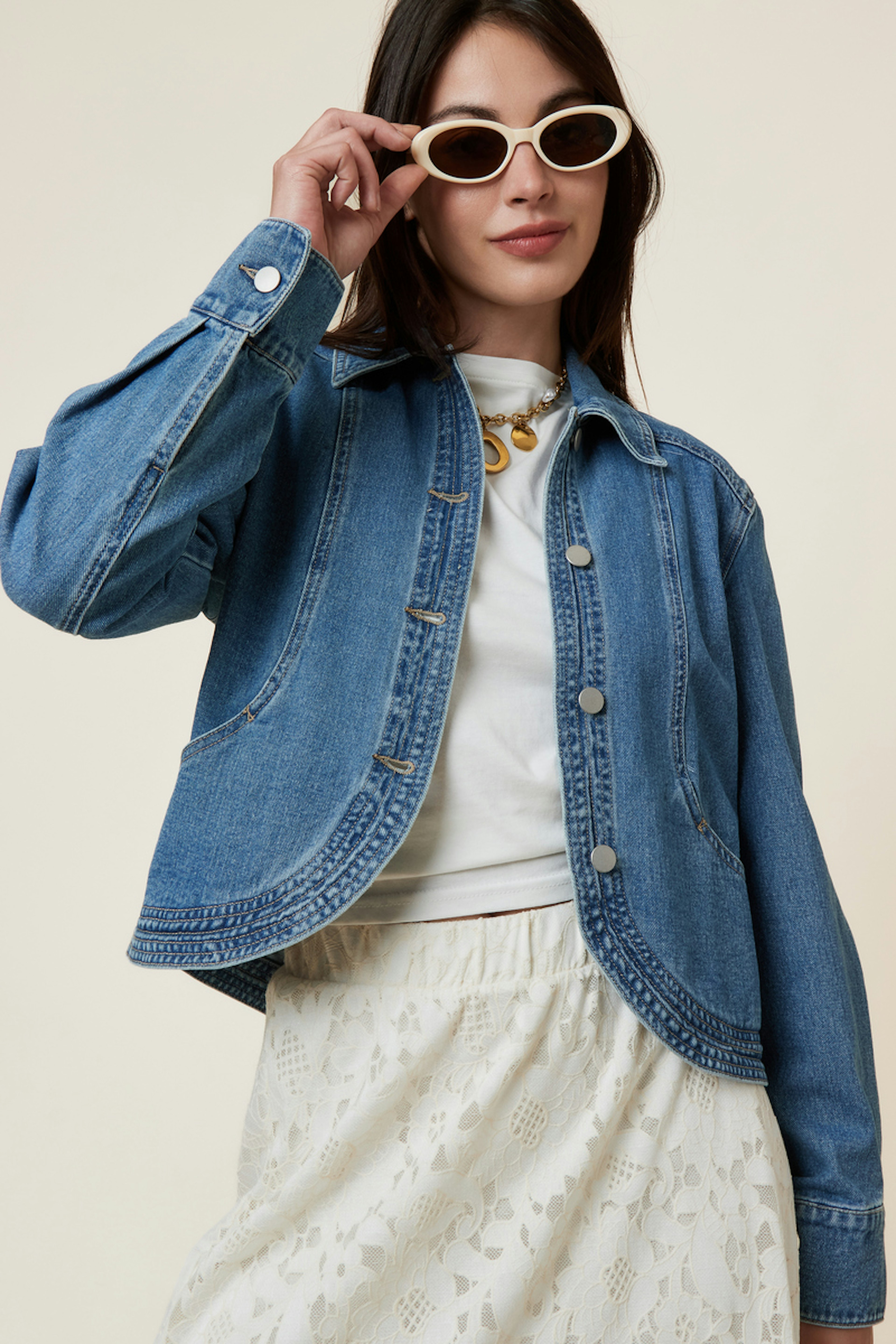 Draag deze denimjas over een vloeiende jurk voor een chique en casual winterlook. Voeg enkellaarsjes toe voor een trendy touch. • Korte denimjas • Rechte pasvorm • Lange mouwen • Drukknopen • Contrasterende stikseldetails