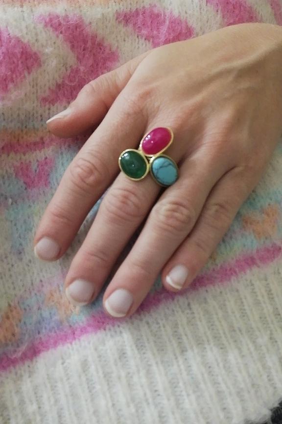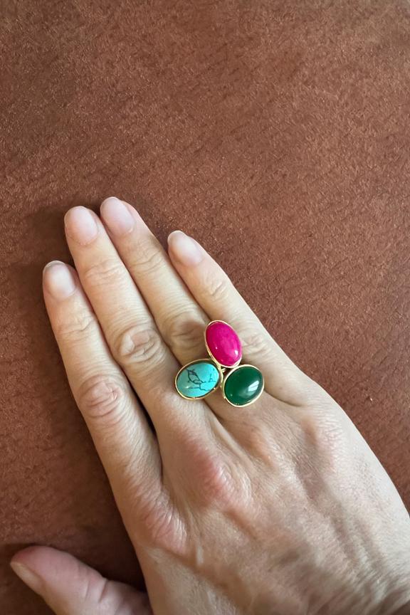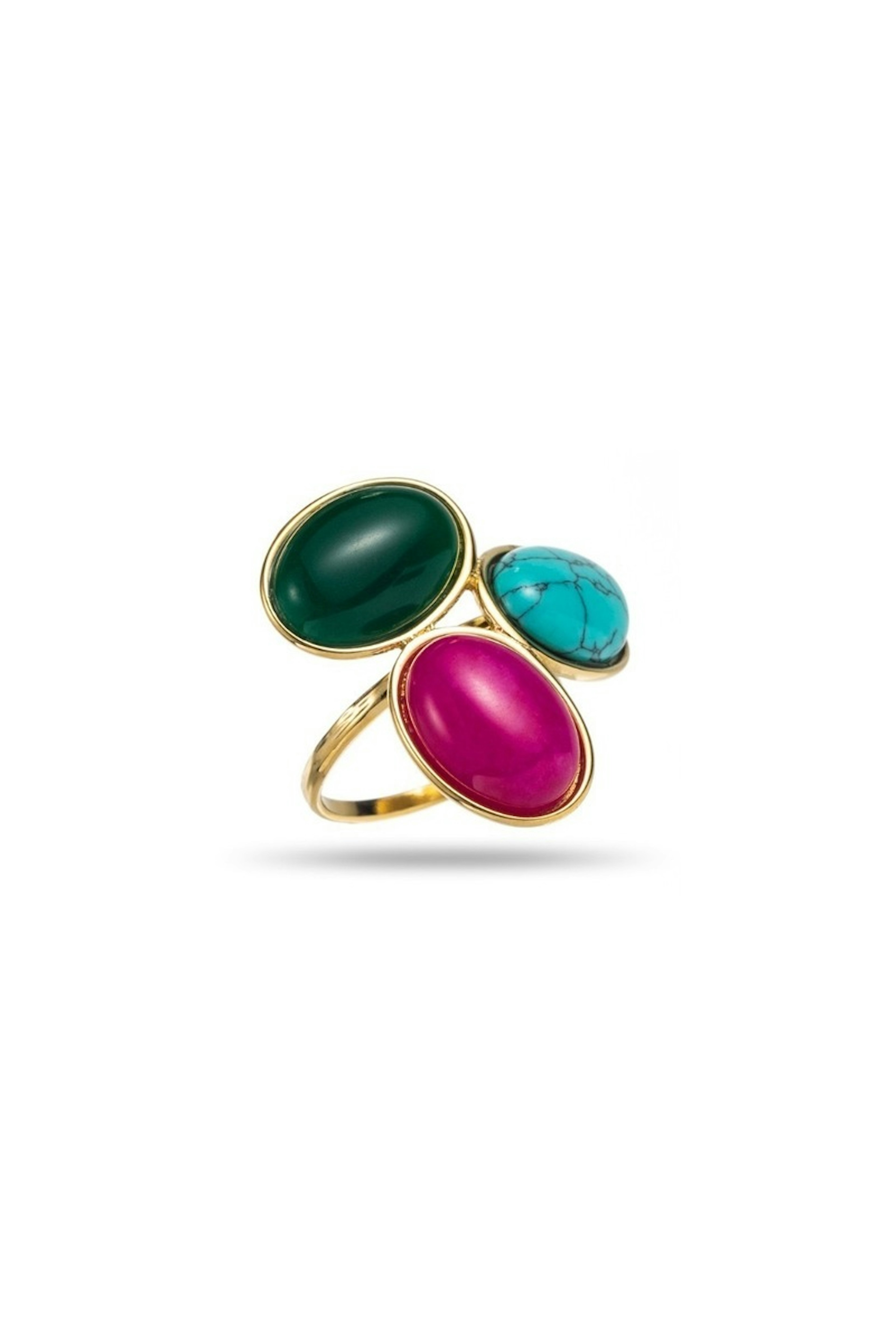 Adoptez cette bague multicolore pour une touche d'รฉclat ร votre tenue, peu importe la saison. โข Bague ร trois pierres โข Monture en acier inoxydable โข Pierres de couleur verte, turquoise โข Design รฉlรฉgant et moderne โข Taille ajustable