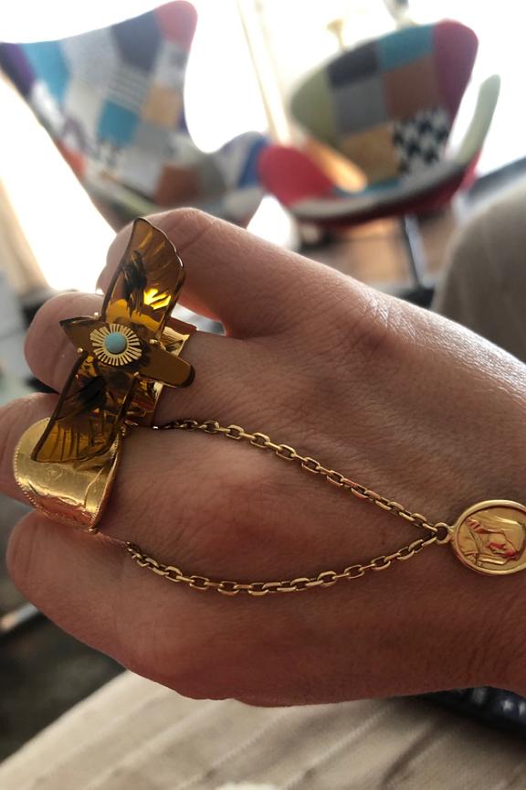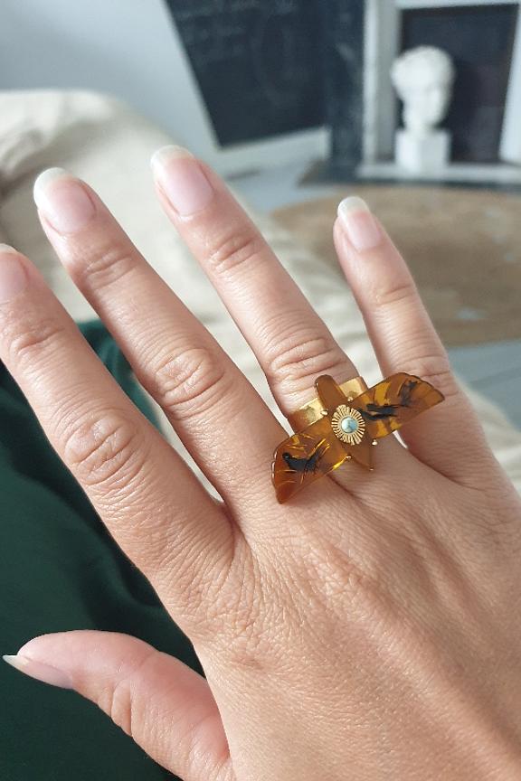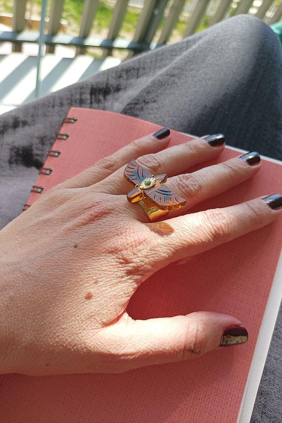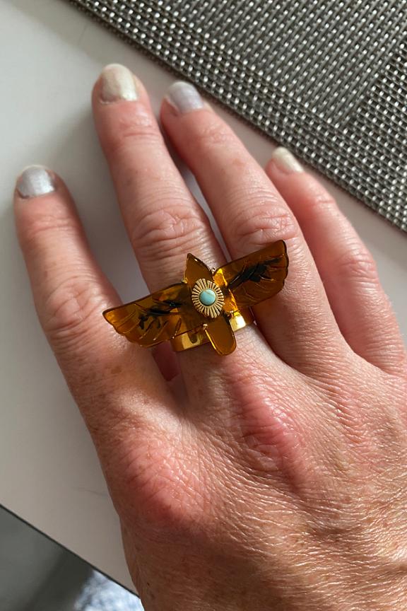 Large bague dorรฉe ร l'or fin 14 carats, dรฉcorรฉe d'un ravissant aigle gravรฉ de couleur ambre, lui-mรชme ornรฉ d'un cabochon turquoise serti effet malachite en son centre. Il rappelle les oiseaux des tribus Zuni.