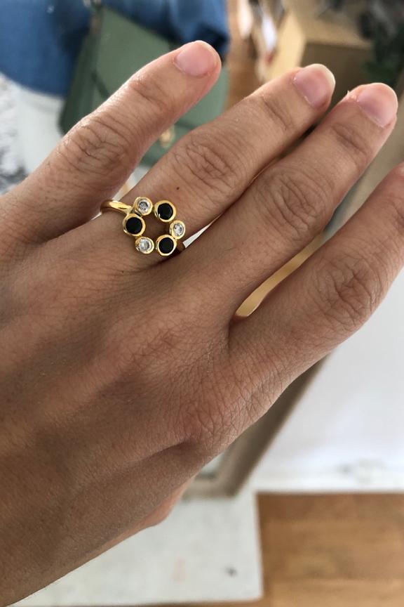Tel un dรฉlicat et scintillant bouton de rose, la bague Laval s'enroule ร votre doigt. Composรฉe de l'alternance d'un oxyde de zirconium et d'une pierre d'onyx noir, elle se porte aussi bien seule qu'en accumulation.