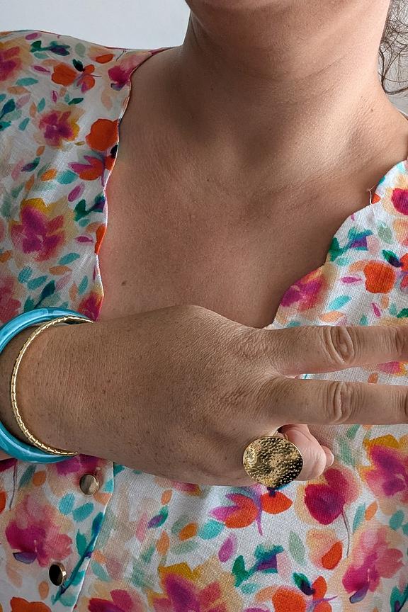 Ajoutez une touche d'élégance à votre tenue avec cette bague raffinée. Associez-la à un chemisier en soie pour un look sophistiqué parfait en toute saison. • Bague en acier inoxydable • Doré à l'or fin • Design tendance et durable • Finition martelée • Taille ajustable