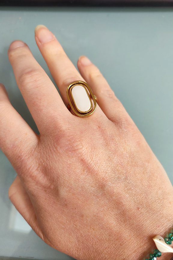 Flirtez avec l'รฉlรฉgance en toute saison en associant cette bague Milรซ Mila ร une manucure soignรฉe et un pull doux aux tons neutres. โข Bague en acier inoxydable โข Forme ovale รฉpurรฉe โข Bicolore blanc et dorรฉ et autre cotรฉ noir