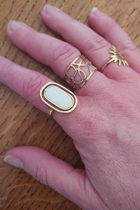 Flirtez avec l'รฉlรฉgance en toute saison en associant cette bague Milรซ Mila ร  une manucure soignรฉe et un pull doux aux tons neutres. โ€ข Bague en acier inoxydable โ€ข Forme ovale รฉpurรฉe โ€ข Bicolore blanc et dorรฉ et autre cotรฉ noir