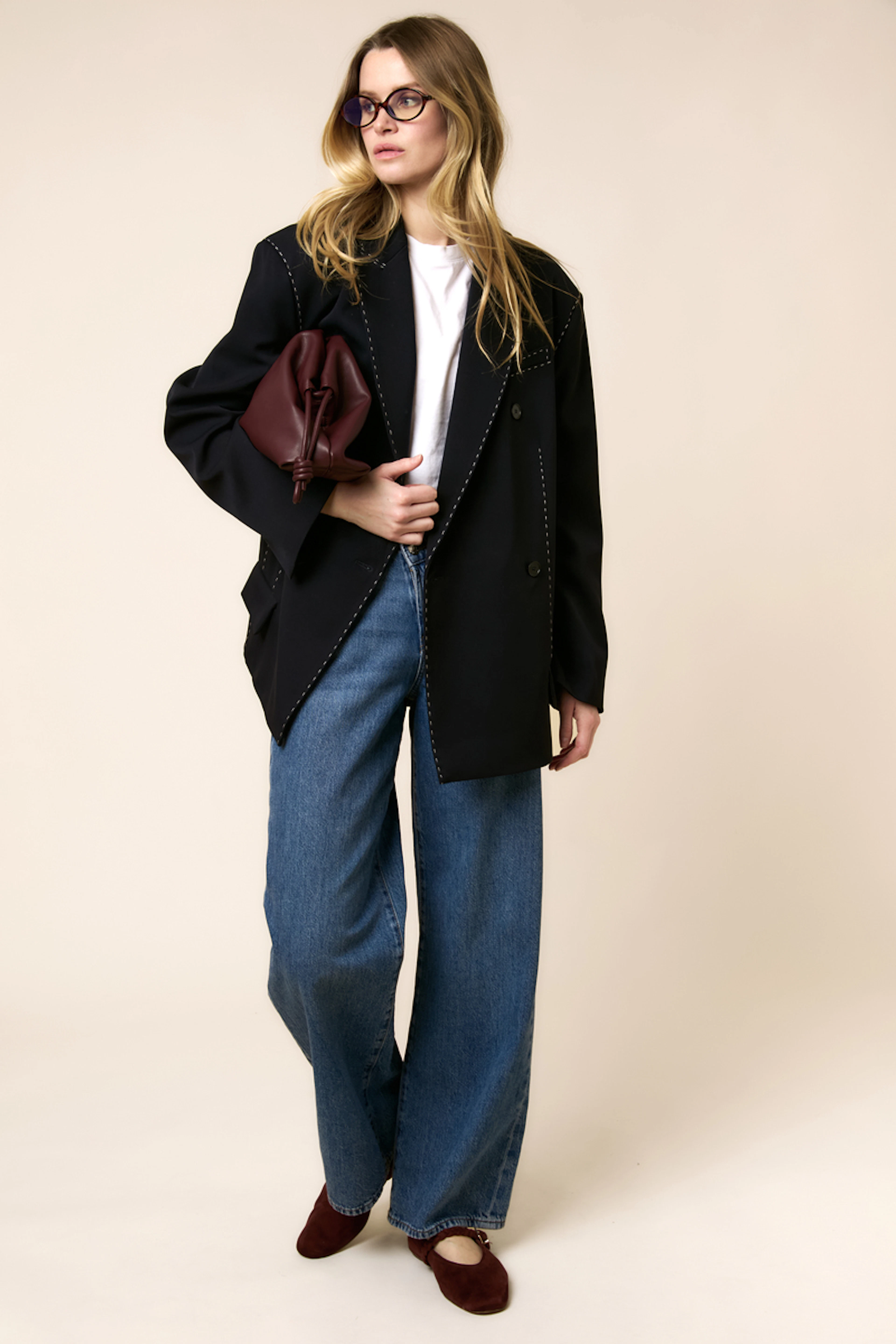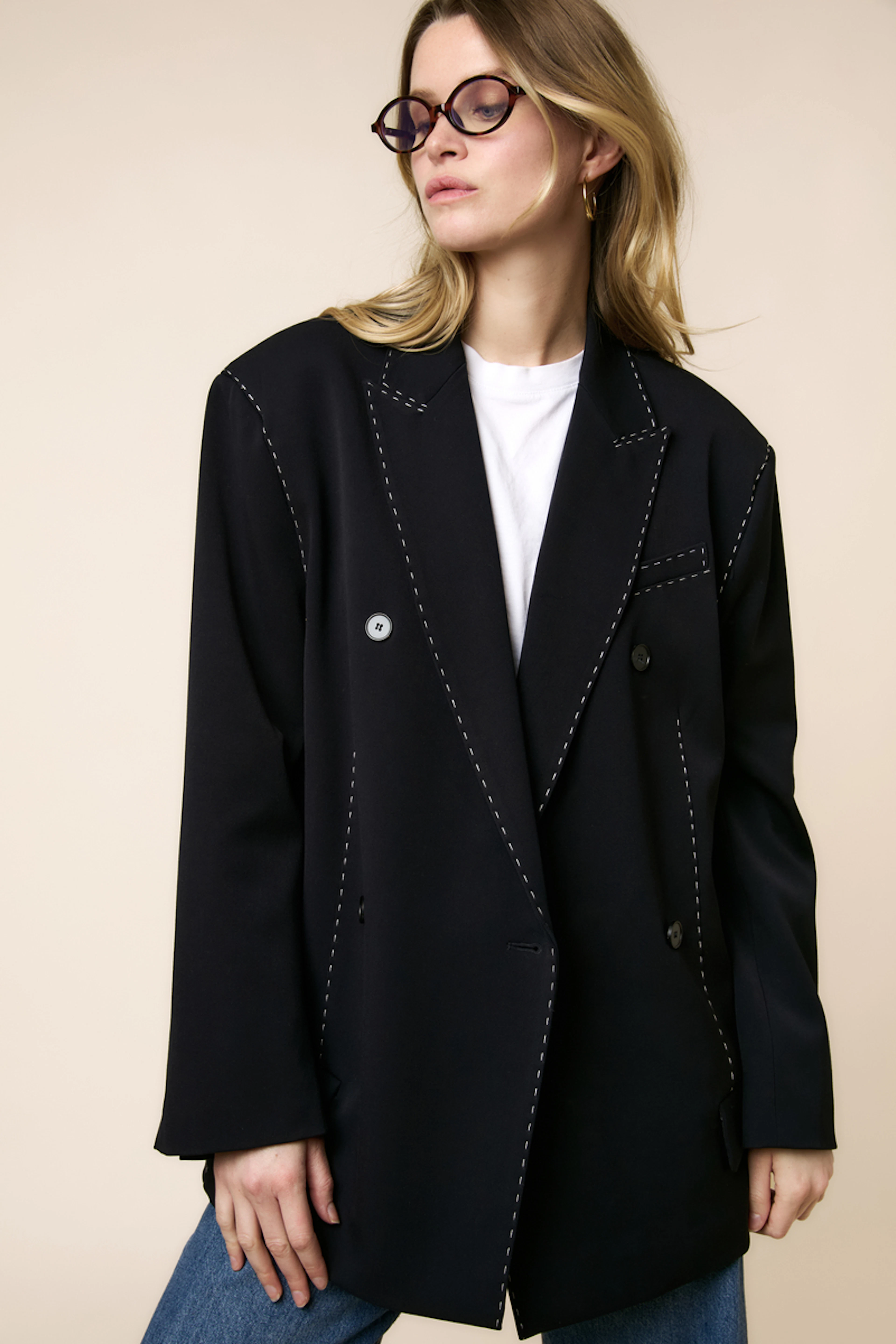 Portez ce blazer bleu marine sur un jean brut et des bottines pour un look chic. Ajoutez un foulard coloré pour une touche de peps. • Blazer long • Coupe oversize • Double boutonnage • Poches à rabat • Surpiqûres contrastées