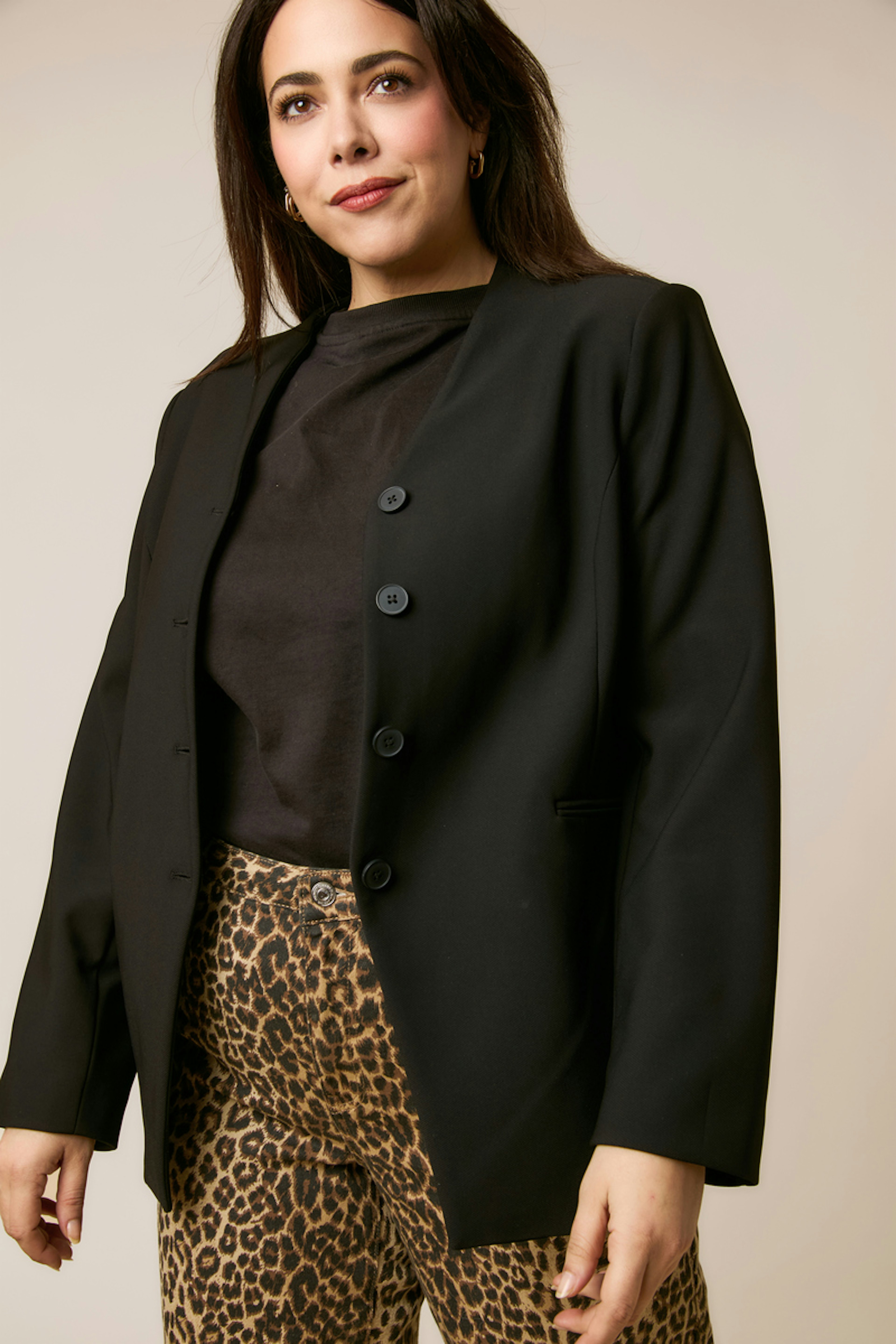 Associez ce blazer noir élégant avec un chemisier en soie et des bottines pour une allure chic. Idéal pour rester élégante tout l'hiver. • Blazer noir • Coupe droite élégante • Manches longues • Fermeture à boutons • Poches passepoilées