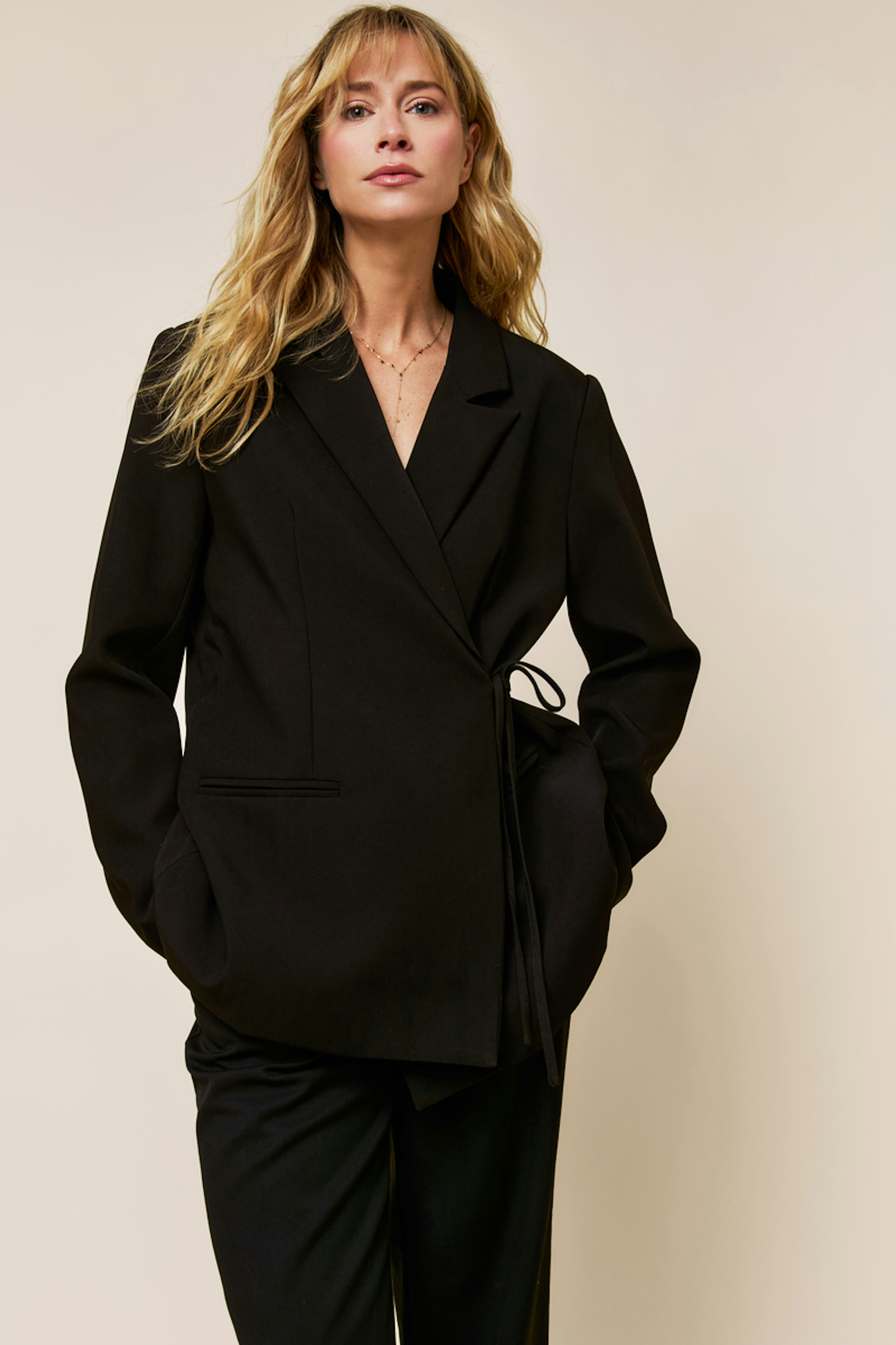 Portez ce blazer avec un pantalon cigarette et des escarpins pour une allure sophistiquée en plein hiver. • Blazer noir • Coupe cintrée • Manches longues • Fermeture portefeuille • Poches passepoilées