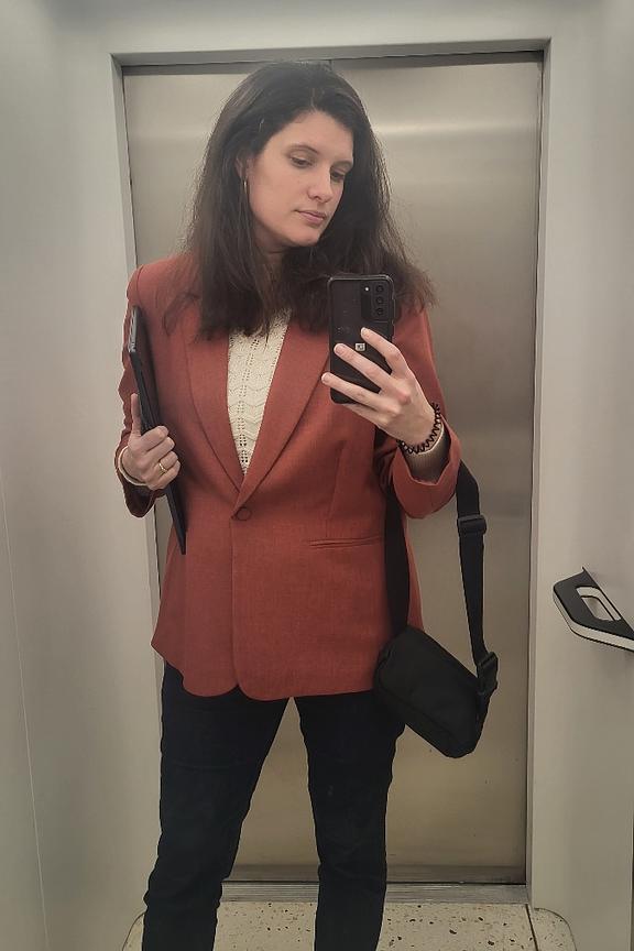 “Archi gros coup de cœur sur cette veste Le petit bouton est top pour fermer la veste et ça donne vraiment un impression de tenue professionnelle quoi qu’on mette avec. Je l’achèterai très prochainement !”