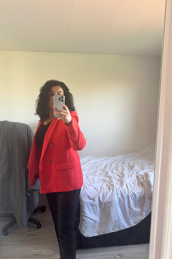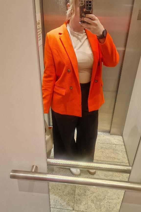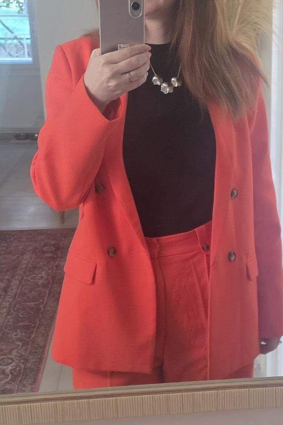 “Tres joli blazer avec épaulettes a la coupe oversize. Il est stylé et j'ai reçu plusieurs compliments. A noter que la couleur est plutot rouge-orange, plus vive que sur les photos -mais tres jolie !”