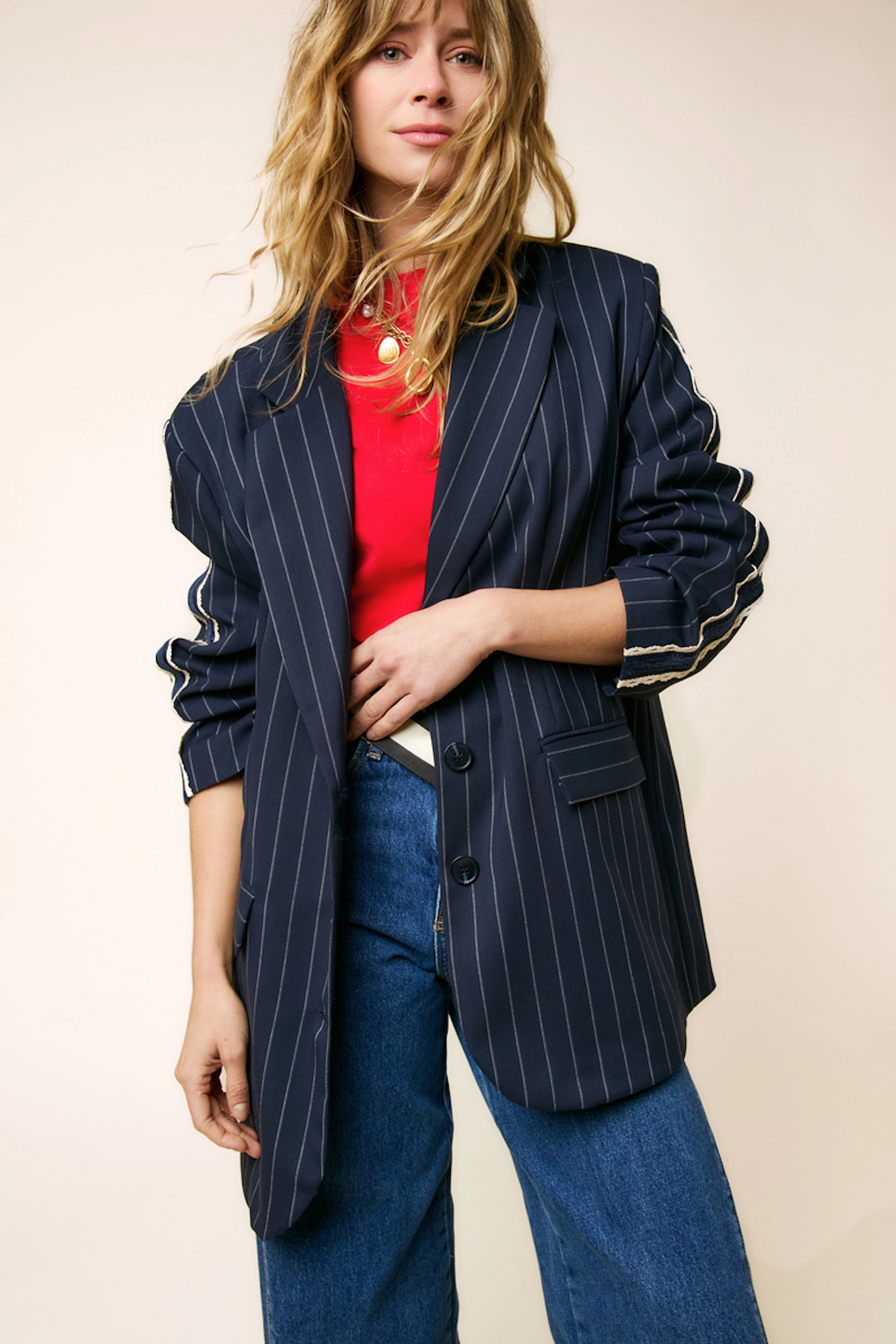 Portez ce blazer avec un jean clair et un t-shirt blanc pour une allure décontractée chic. Parfait pour toutes les saisons! • Blazer à rayures • Coupe oversize • Manches longues • Fermeture à trois boutons • Détails de poches à rabat