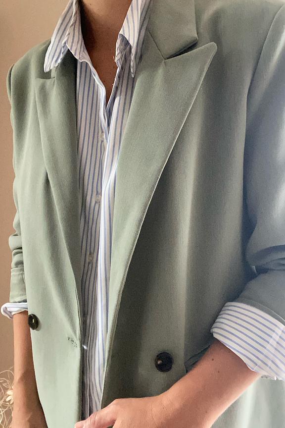 Pimentez votre look avec ce blazer vert en l'associant à un jean décontracté et des baskets blanches. Parfait pour un style chic et moderne. • Blazer vert • Coupe oversize • Épaules structurées • Fermeture à un bouton • Poches à rabat