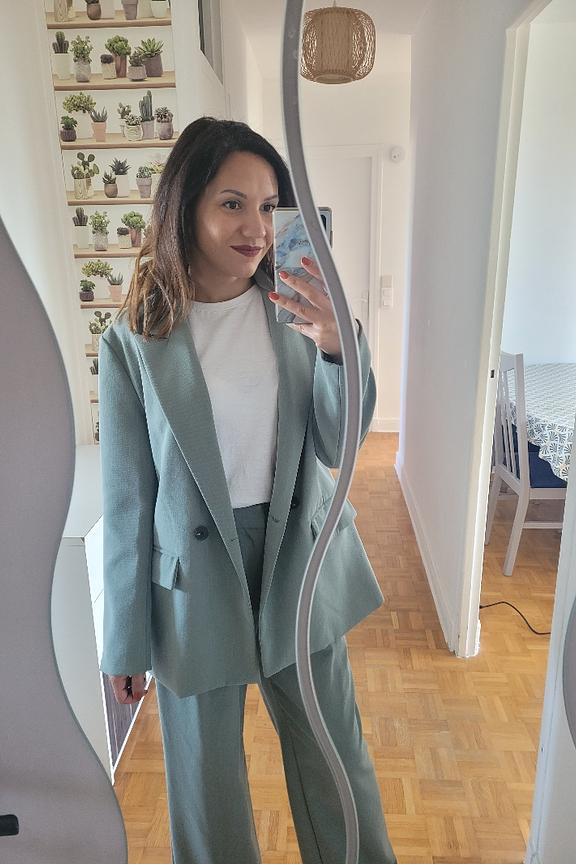 “Veste oversize je n'ai pas l'habitude, j'ai noté qu'elle était à la bonne taille car c'est son style (elle n'est pas trop grande, juste le style oversize). Agréable à porter et très belle couleur, j'ai pris l'ensemble complet avec le pantalon 😉”