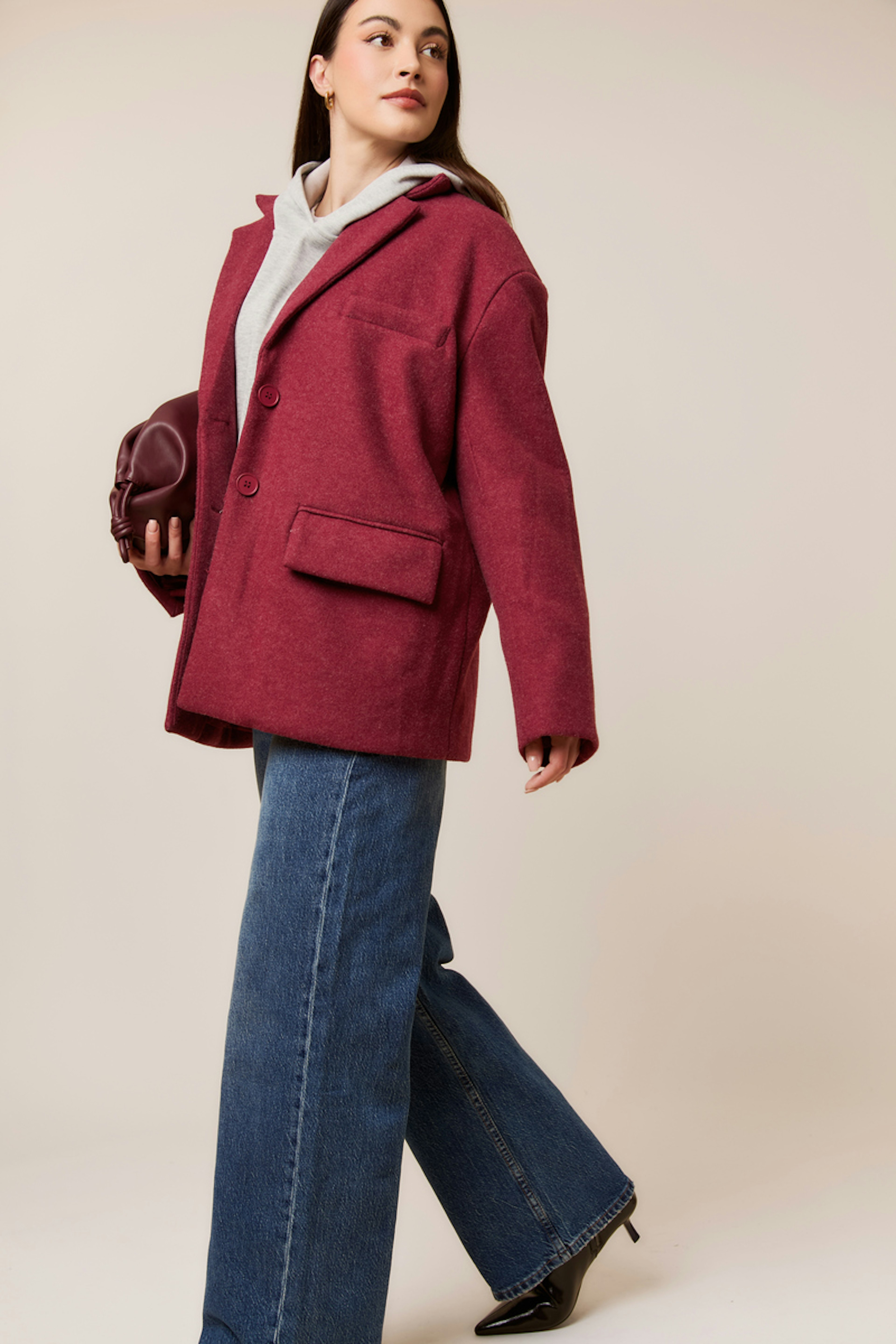 Associez cette veste avec un pull en laine et un jean ajusté pour un look chic et confortable lors des journées froides d'hiver. • Coupe ample • Manches longues • Fermeture boutonnée • Poches à rabat • Couleur rouge intense