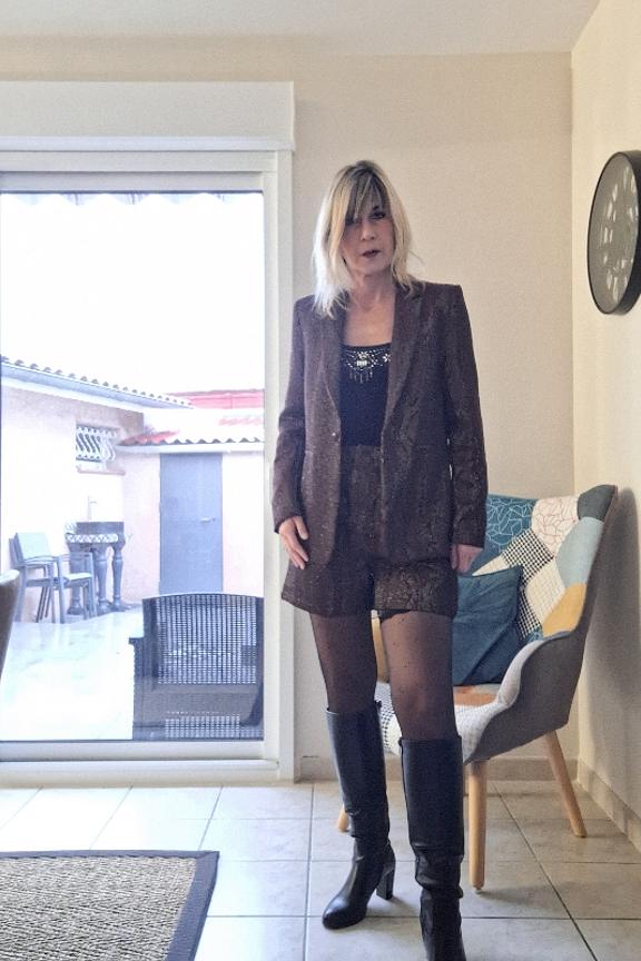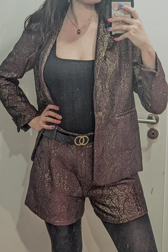 “Très joli ensemble . Tout à fait le type de vêtements qui conforte mon choix de closet : très jolies pièces mais que je ne porterais pas très souvent . Donc mieux vaut les louer !”