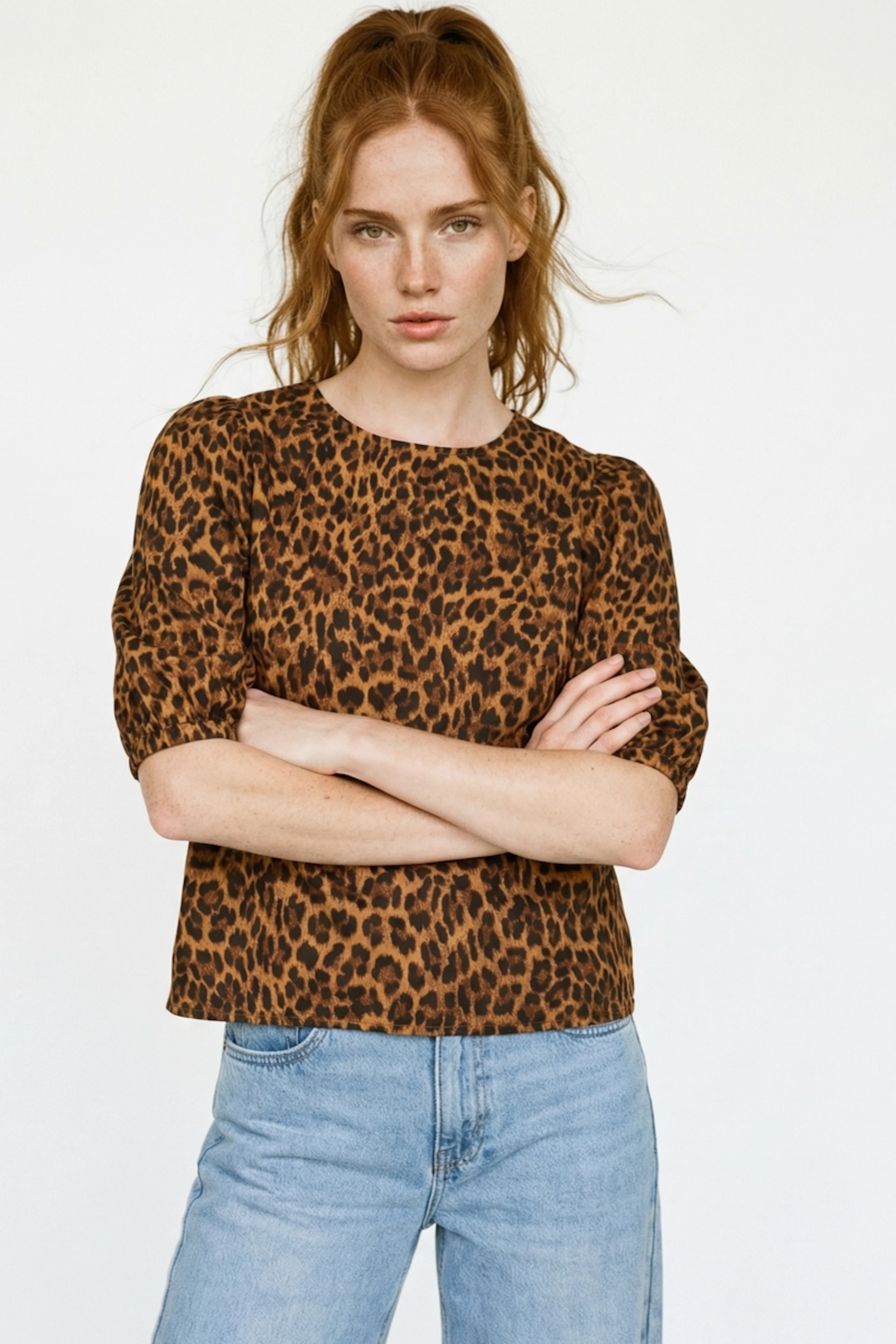 Cette blouse en imprimé audacieux est parfaite pour un look chic et décontracté. Portez-la avec un jean taille haute et des sandales pour un style estival sans effort. • Blouse en coton • Manches bouffantes • Ouverture à l'arrière avec nœuds • Coupe ample et confortable • Imprimé léopard