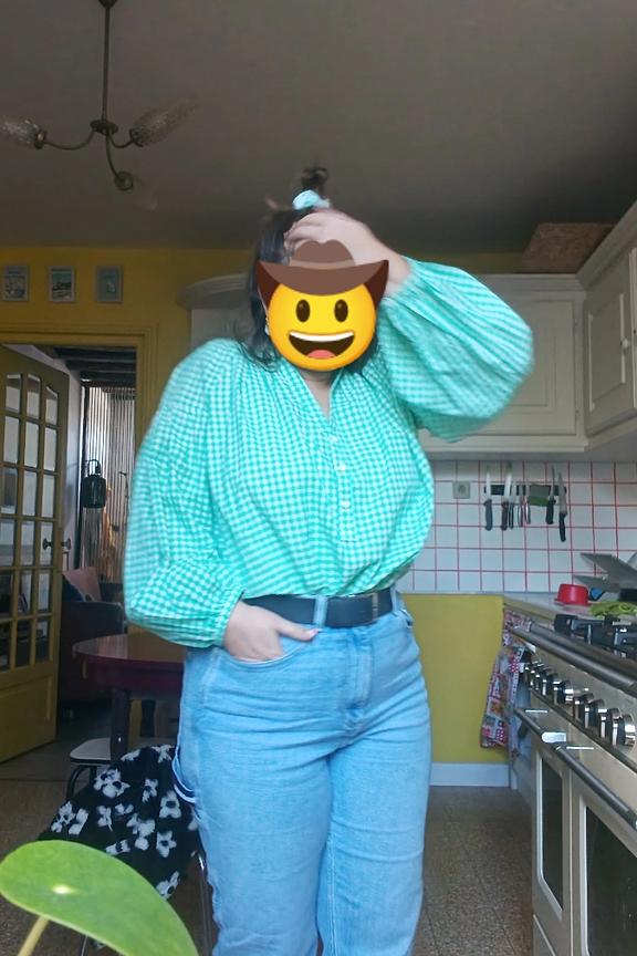“Conforme à la taille mais la coupe est ample néanmoins. Il faut être à l'aise avec ce type de coupe "ballon". Vichy vert très frais et pétillant pour l'hiver. J'aime bien.”