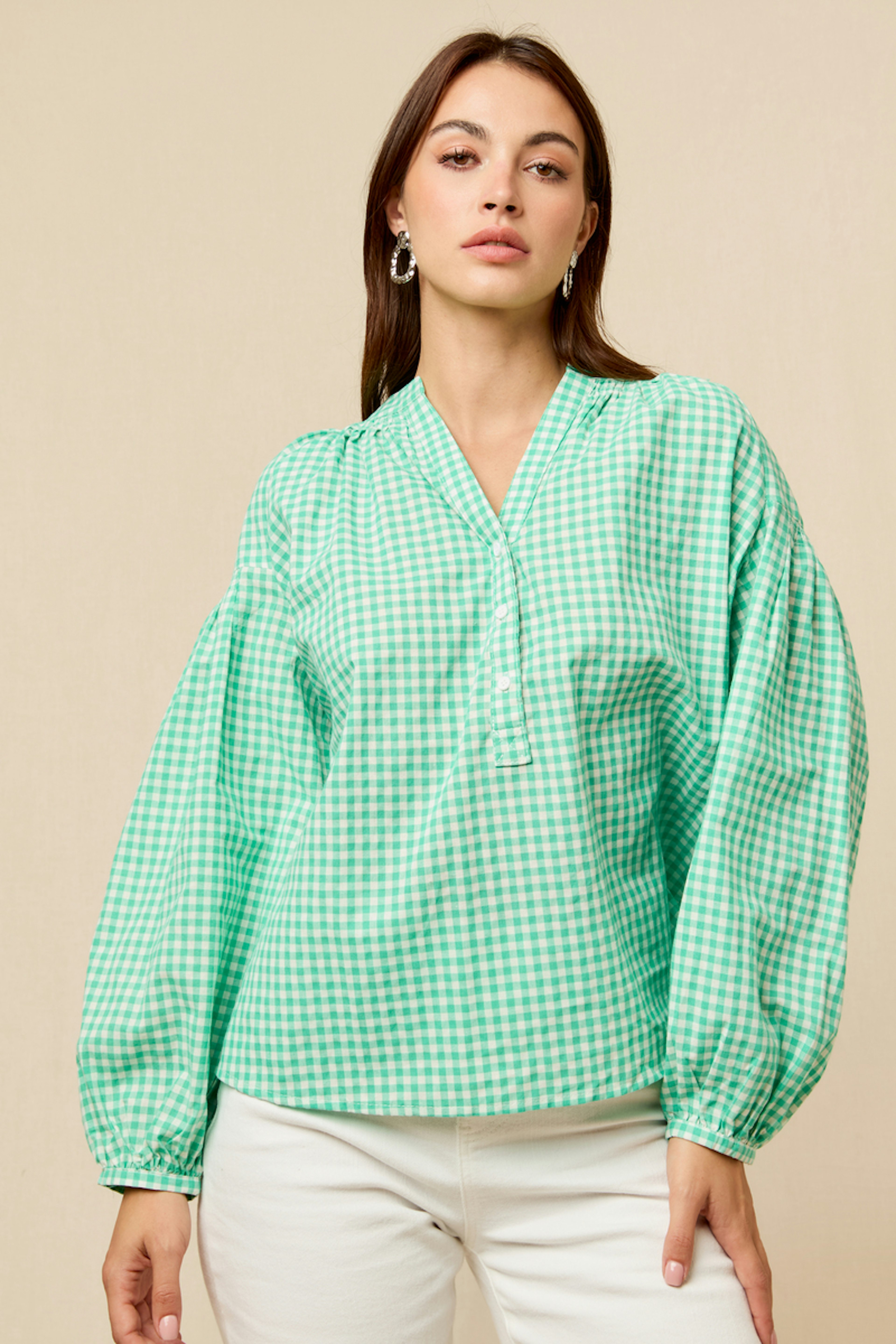 Pour un look décontracté chic, associez cette blouse avec un jean blanc et des sandales en cuir. Parfait en toute saison. • Blouse en coton • Coupe ample • Col en V • Manches bouffantes • Motif vichy