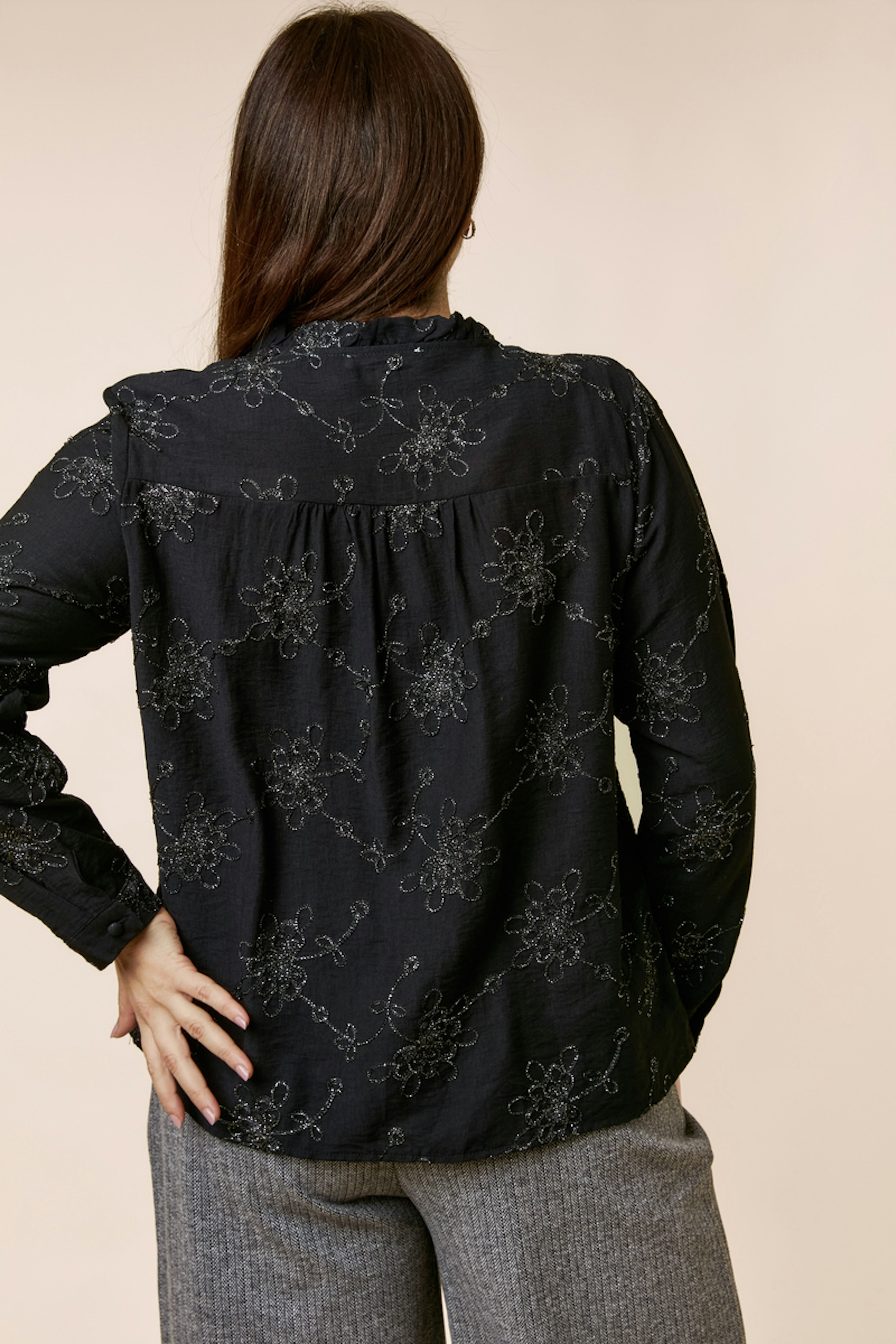 Associez cette élégante blouse noire à un pantalon ajusté et des bottines pour une allure chic hivernale. • Blouse à imprimé floral • Manches longues bouffantes • Décolleté en V délicat • Fermeture à boutons devant • Tissu léger et fluide