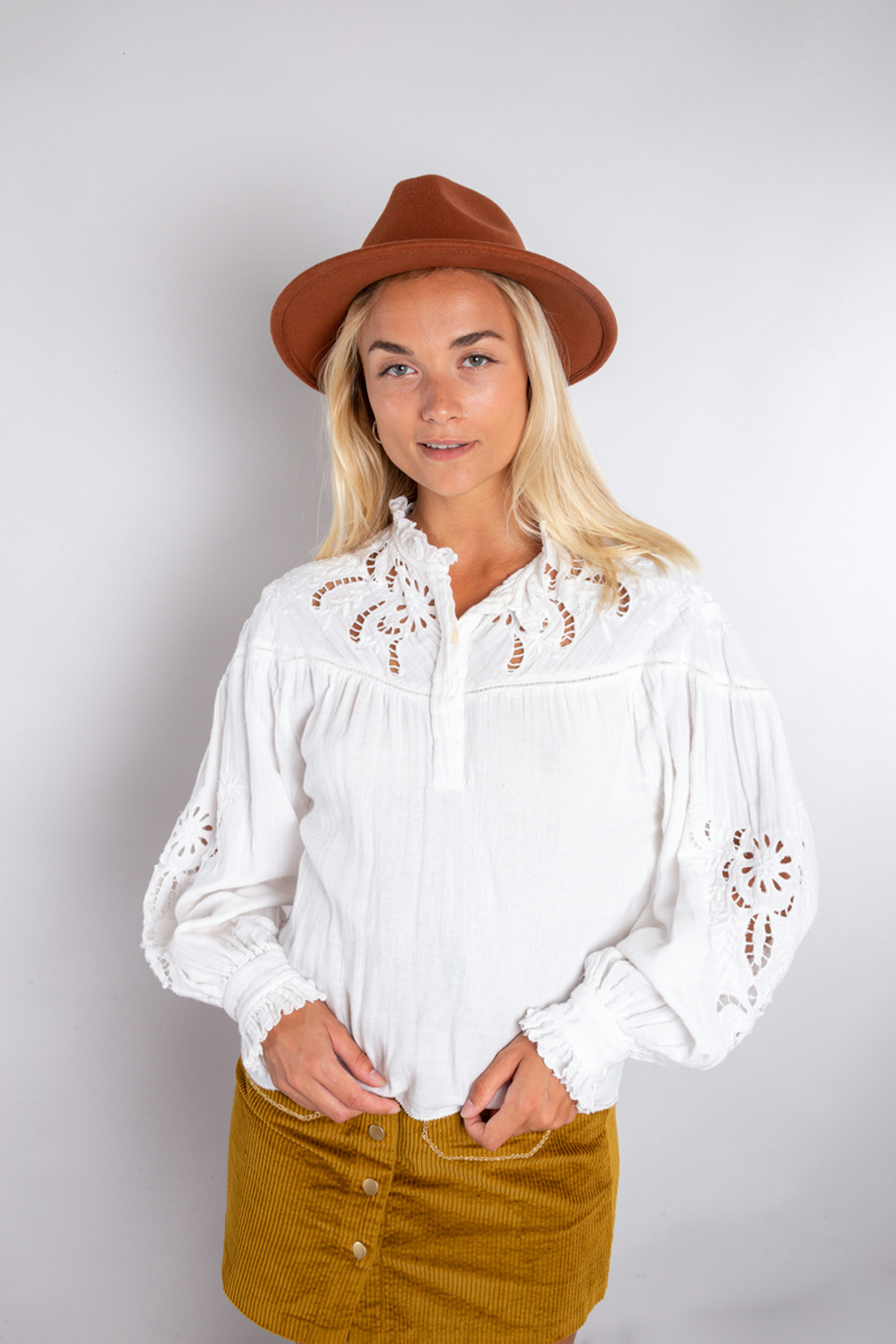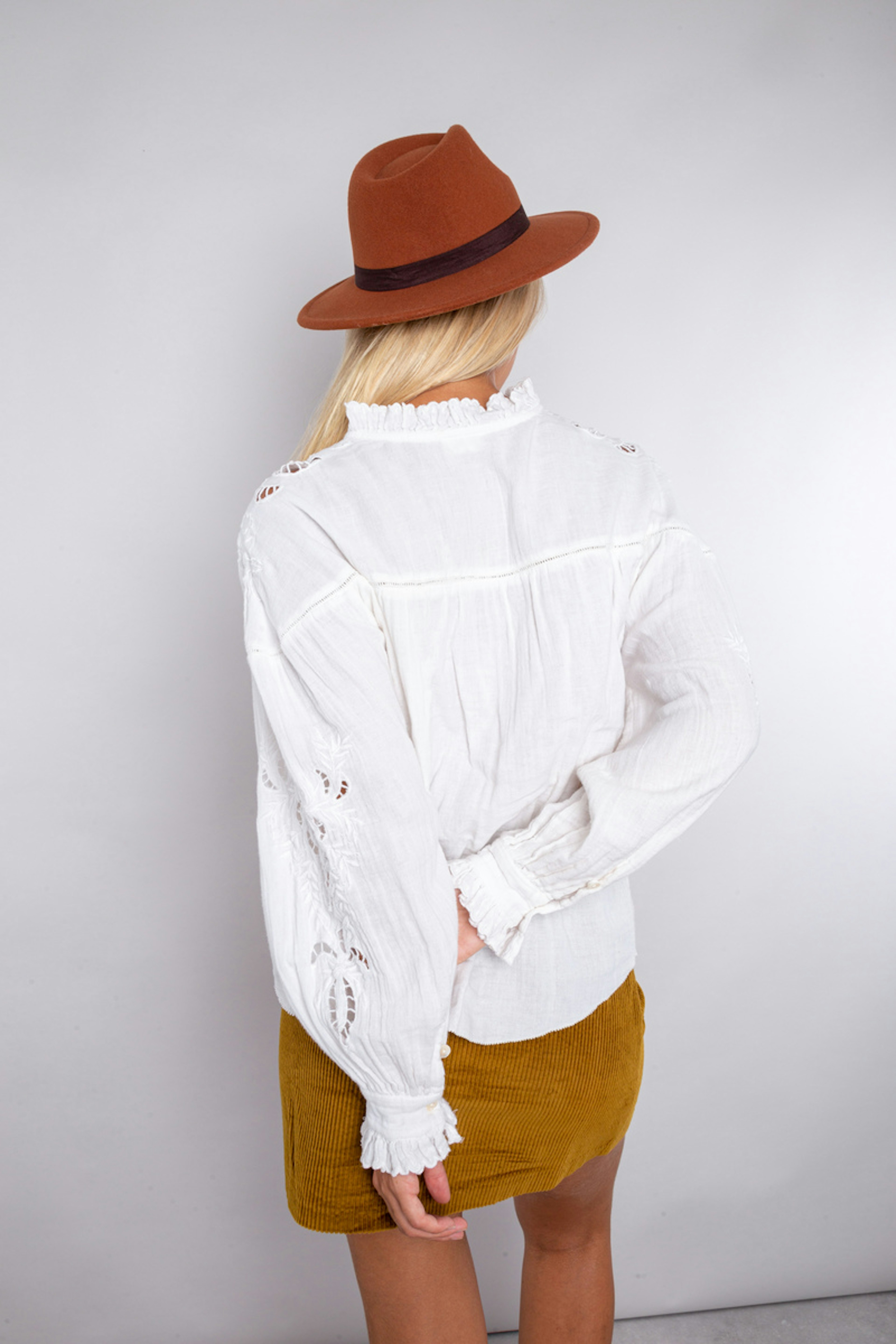 Cette blouse romantique ajourรฉe risque de faire chavirer votre cลur. Son esprit vintage et sa coupe blousante sโinvitent dans votre vestiaire avec beaucoup de douceur. Une piรจce intemporelle ร adopter toute la saison. โข Blouse esprit vintage en double gaze de coton โข Col ร volant brodรฉ et festonnรฉ โข Plastron brodรฉ et ajourรฉ โข Incrustation dโune dentelle jour รฉchelle โข Jeu de fronces sous la dentelle โข Manches raglan et bouffantes โข Poignets chemise ร volants festonnรฉs et brodรฉs โข Base asymรฉtrique