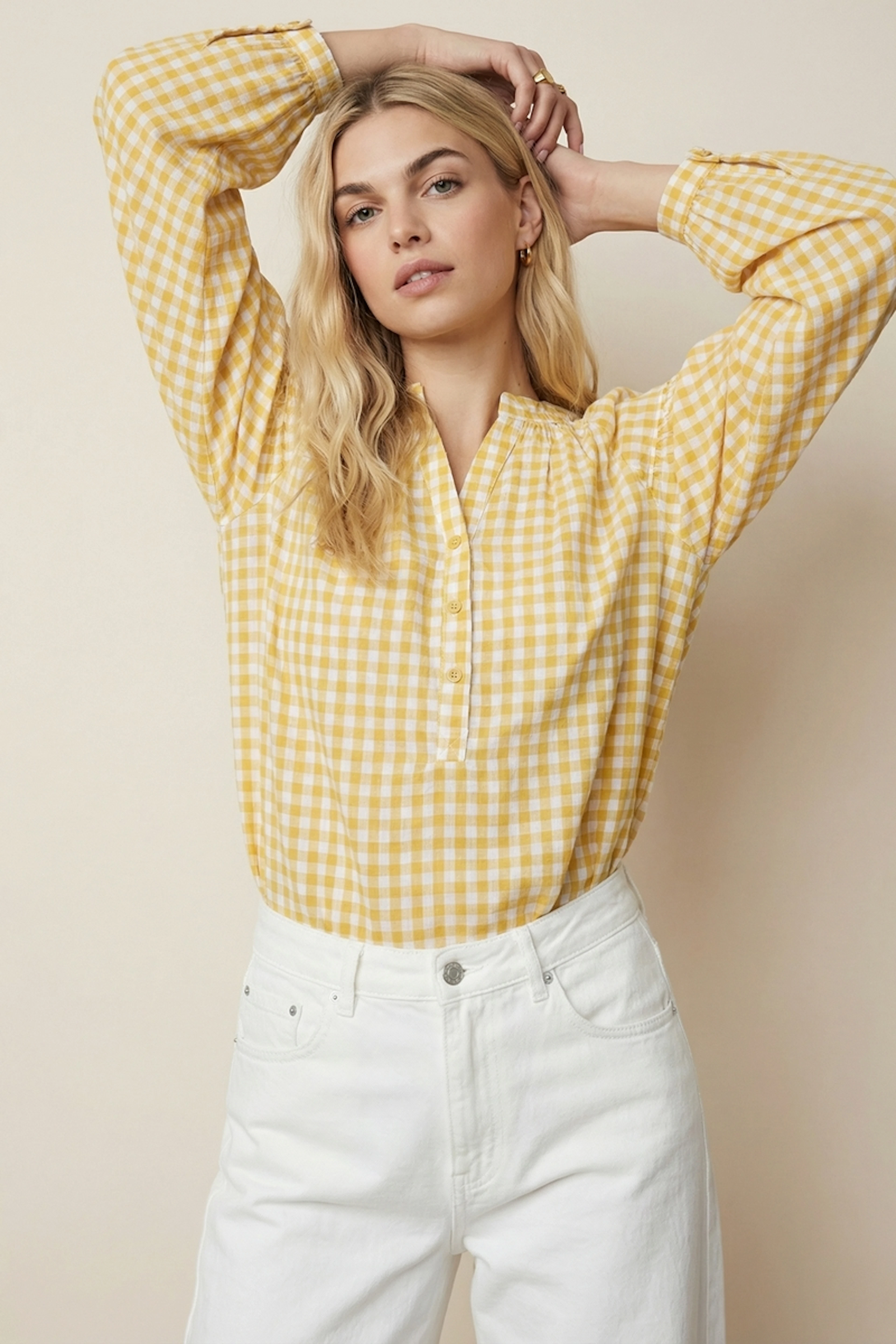 Associez cette blouse à un jean blanc et des sandales pour un look estival et lumineux. • Blouse en coton • Coupe ample • Manches longues • Col Mao • Motif vichy