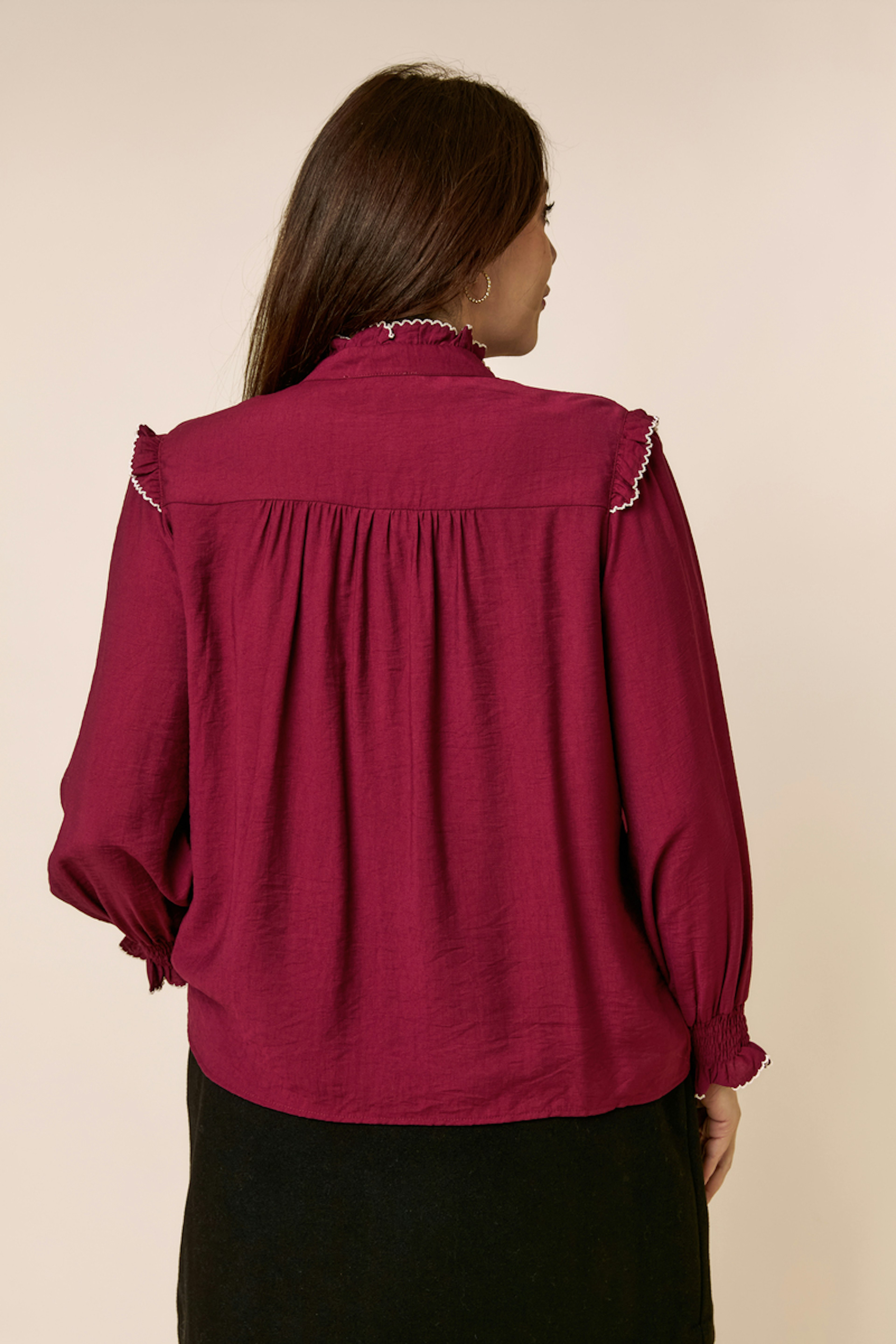 Optez pour une jupe en cuir et des bottines élégantes pour une allure hivernale raffinée. • Blouse à manches bouffantes • Col volanté structuré • Fermeture boutonnée frontale • Poignets élastiqués • Détail de bordure contrastante