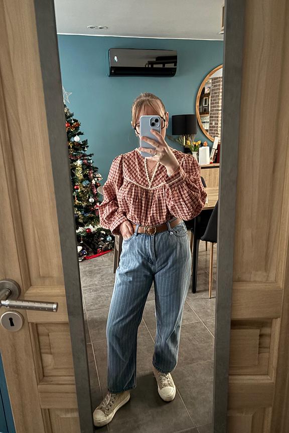 Associez cette blouse ร  un pantalon en cuir et des bottines pour un look chic hivernal. โ€ข Chemise ร  manches longues โ€ข Coupe ample et fluide โ€ข Col en V dรฉlicat โ€ข Motif quadrillรฉ โ€ข Dรฉtails en dentelle รฉlรฉgante