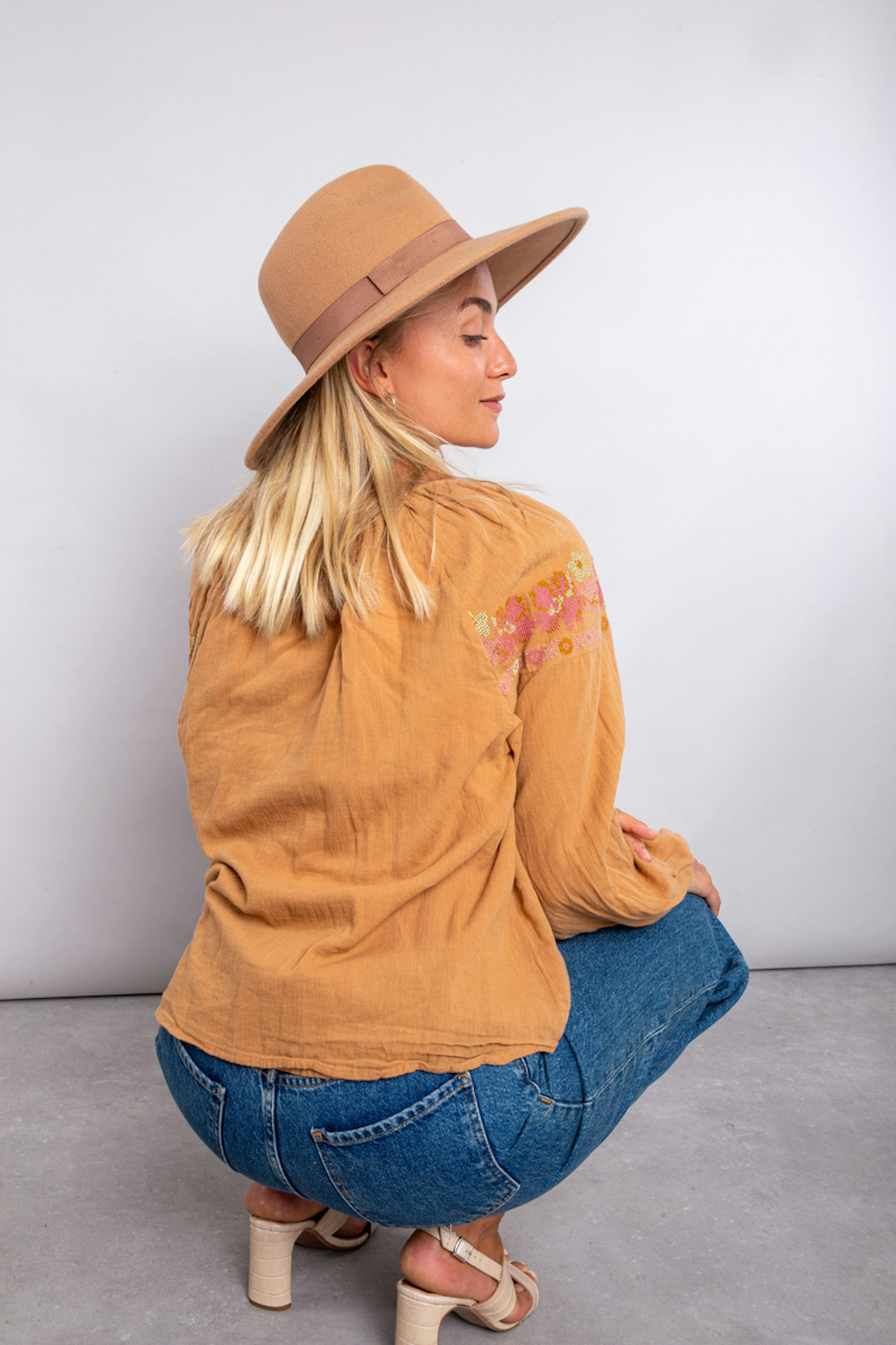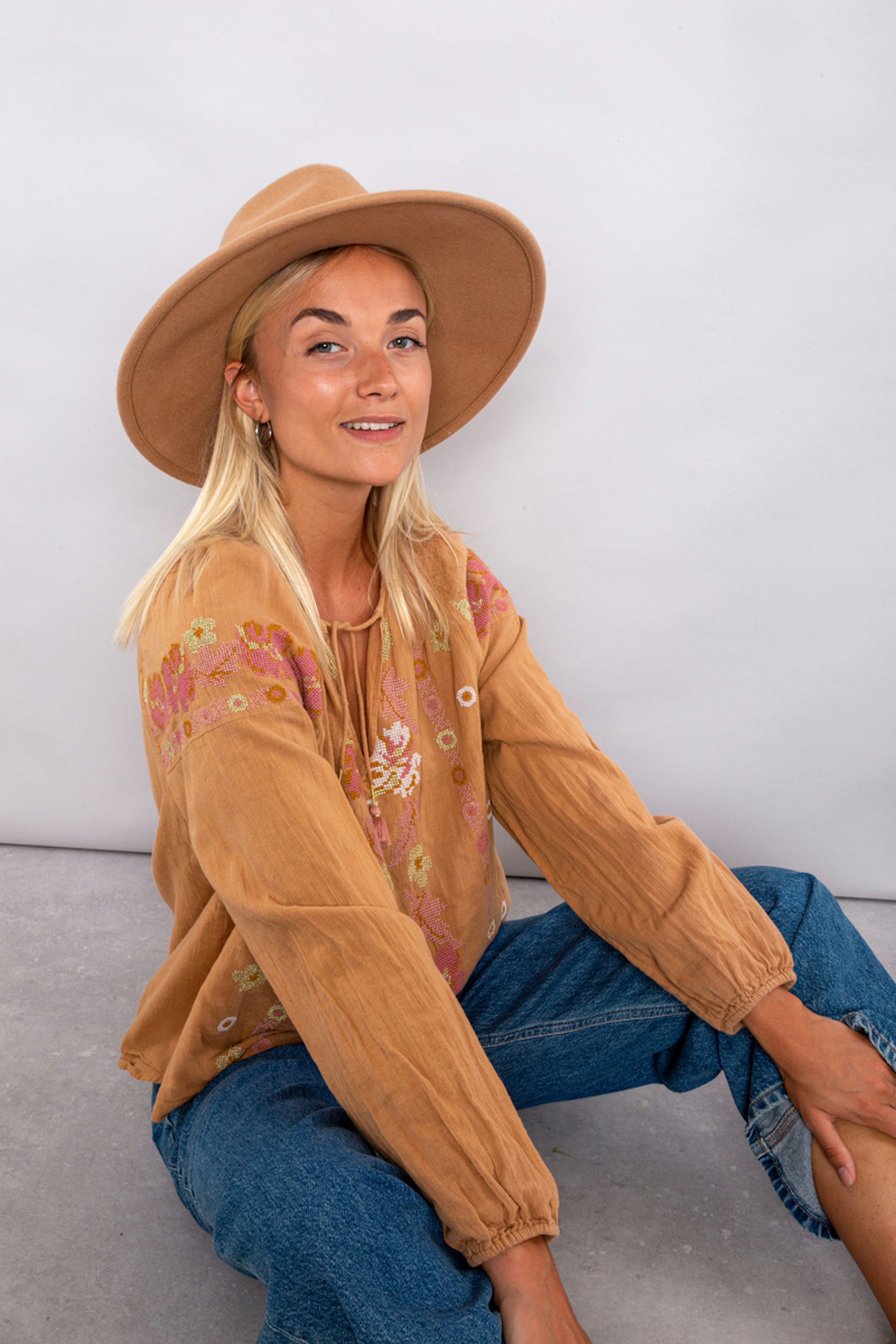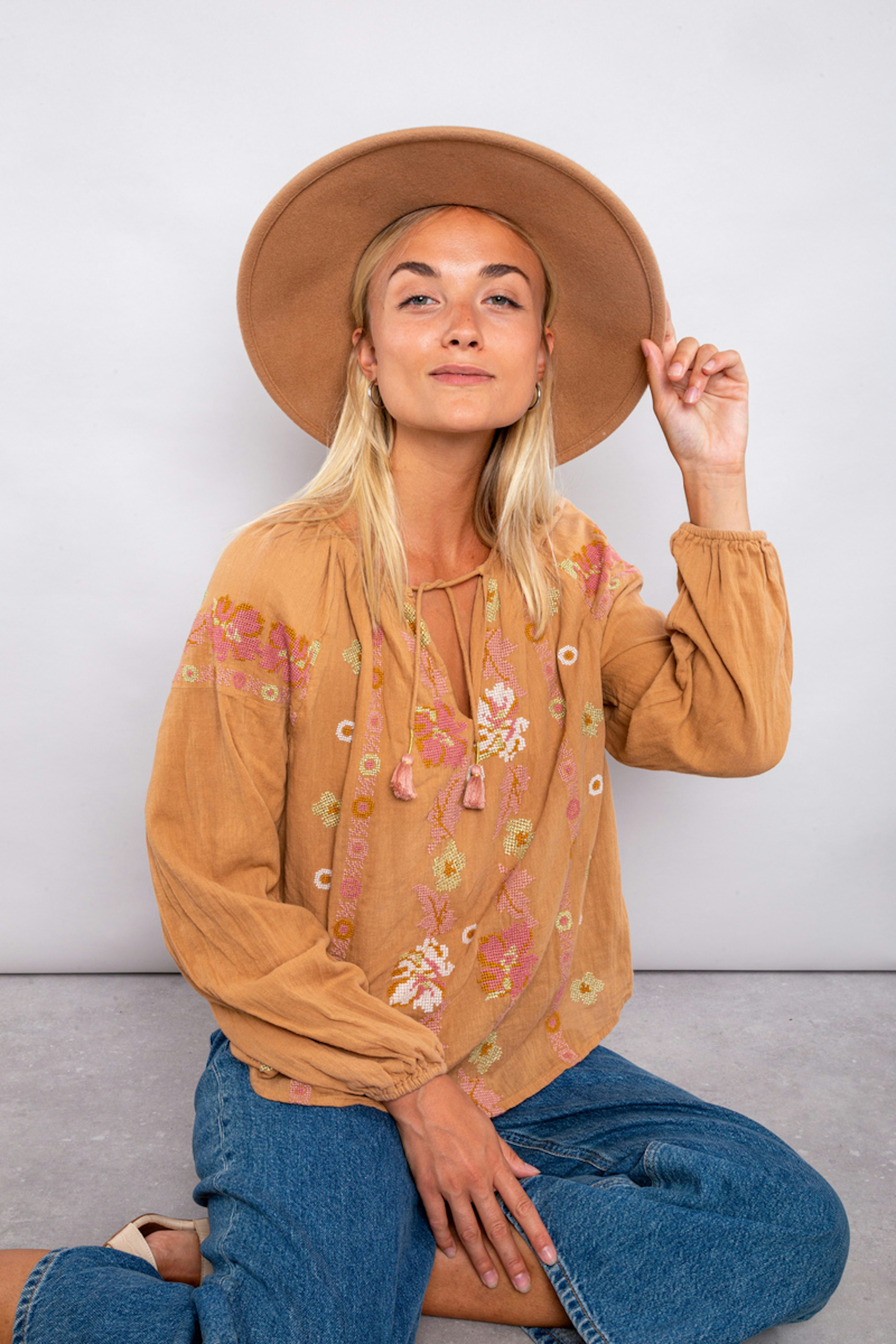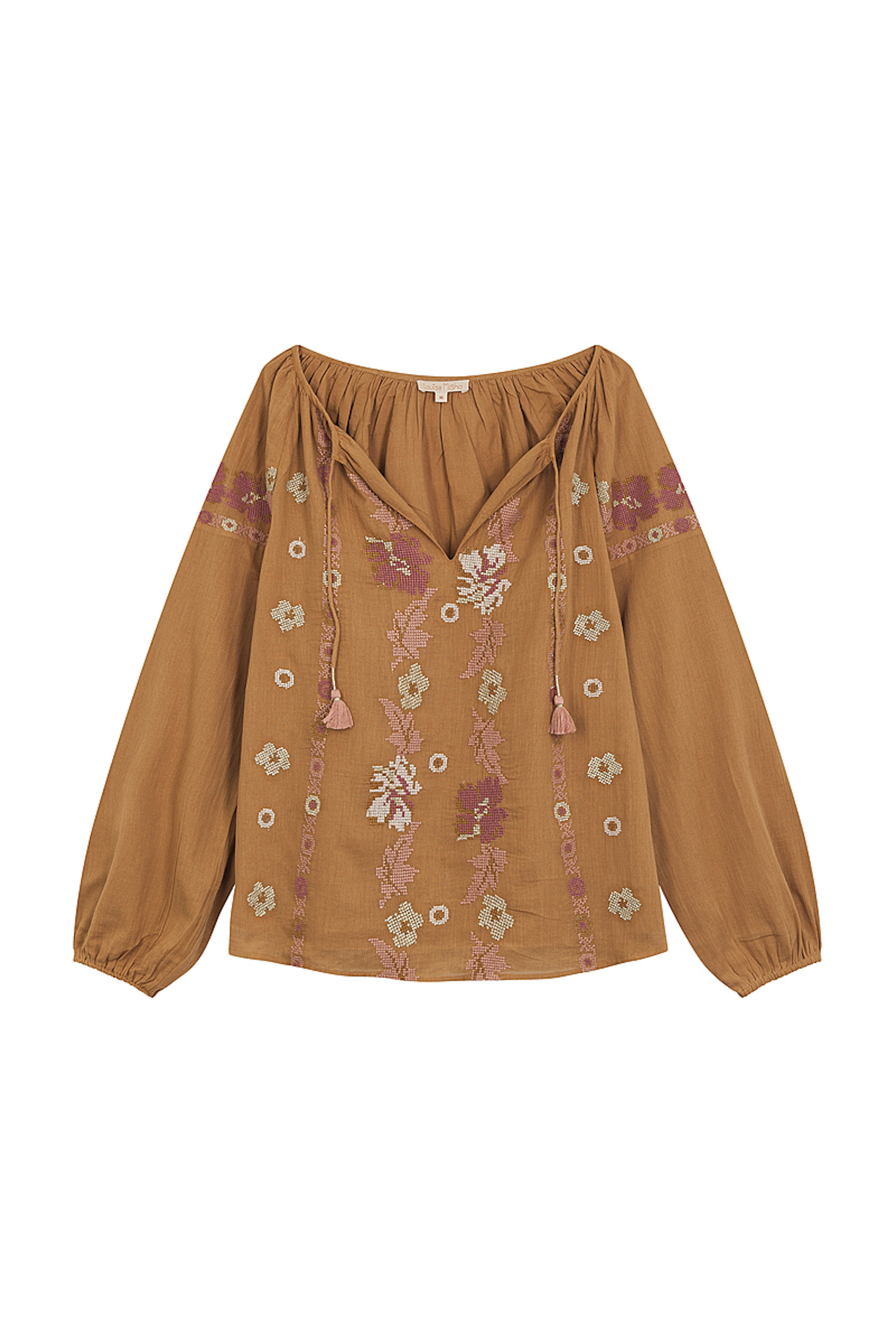 โข Blouse ample de couleur noisette โข Dรฉlicates broderies florales โข Manches bouffantes resserrรฉes aux poignets โข Col en V soulignรฉ de jolis liens ร pompons roses