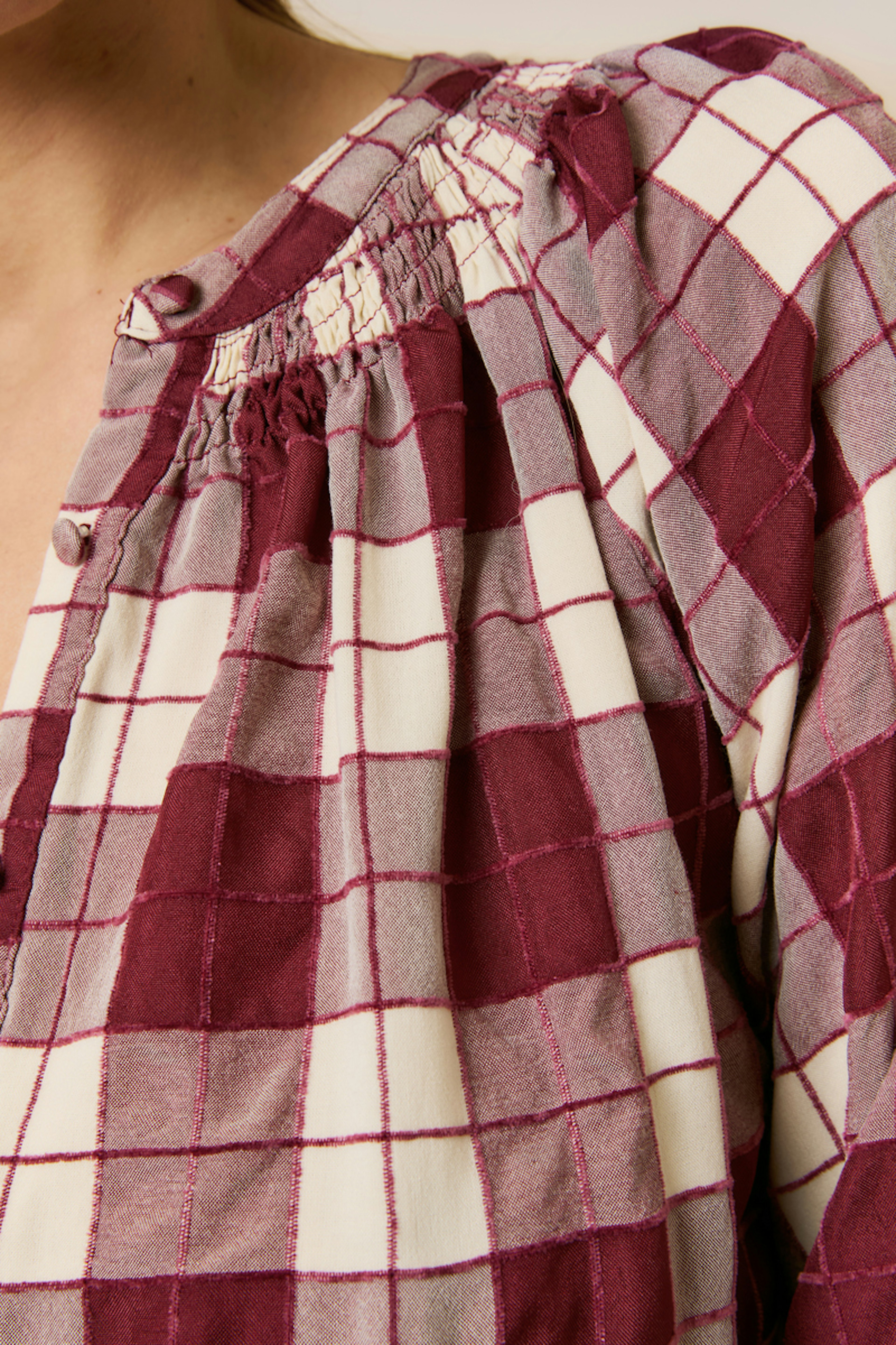 Ajoutez une touche bohème à votre look avec cette chemise à carreaux. Portez-la avec un jean flare et des bottines. Parfaite pour une douceur saisonnière. • Chemise à carreaux • Manches longues bouffantes • Détails fronçés à l'encolure • Boutonnage sur le devant • Imprimé carreaux rouge et blanc