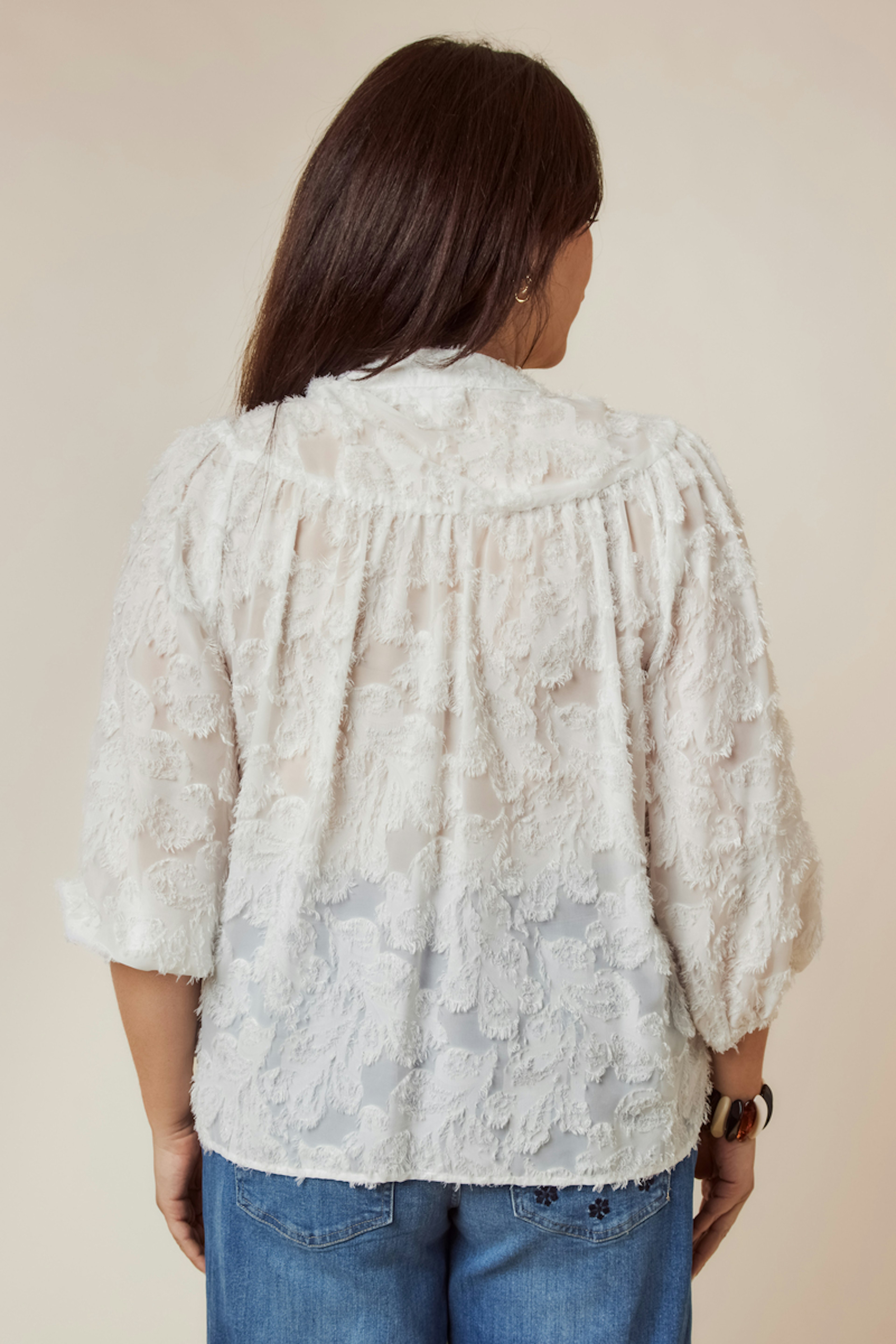 Cette blouse blanche élégante, avec son motif délicat, se marie parfaitement avec un jean décontracté ou un pantalon habillé pour un look chic et intemporel. Idéale en toute saison. • Blouse jacquard • Col tunisien • Manches 3/4 • Légère et sans col • Motif imprimé