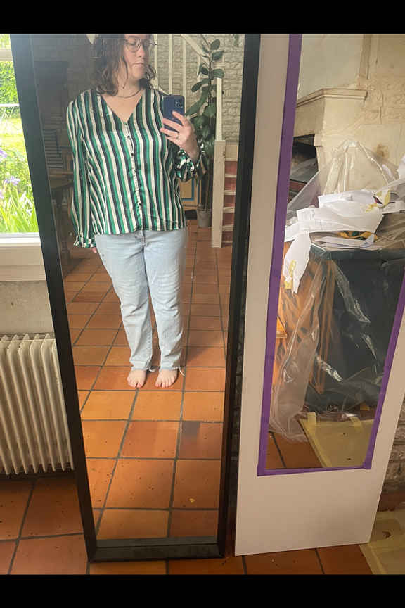 “Beau chemisier finitions sur les manches ne peut pas plaire a tous le monde un peu large pour moi en 44 mais très agréable a porter et belle effet.”