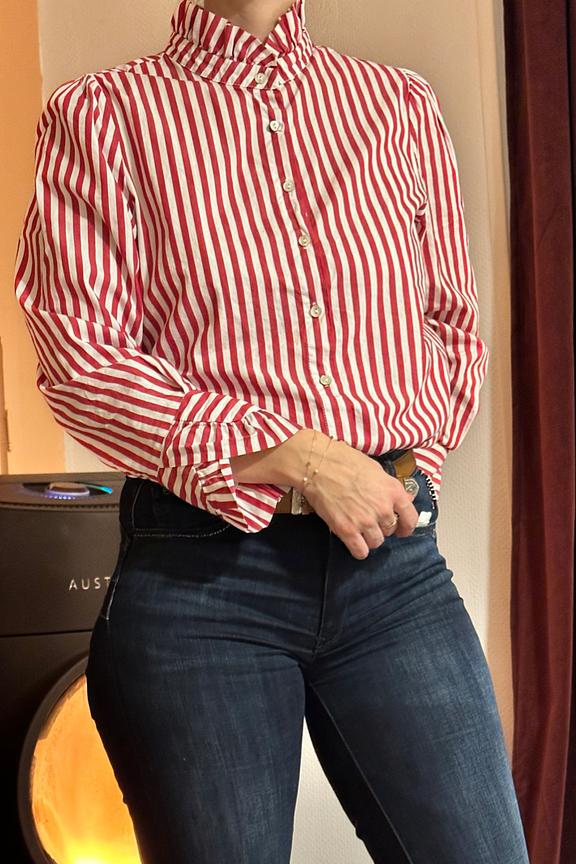 Optez pour un style moderne en associant cette blouse rayée à un jean slim noir et des boucles d'oreilles argentées. Parfait pour un look chic et tendance. • Chemise rayée • Col montant élégant • Manches longues • Boutons délicats • 100% coton doux et léger
