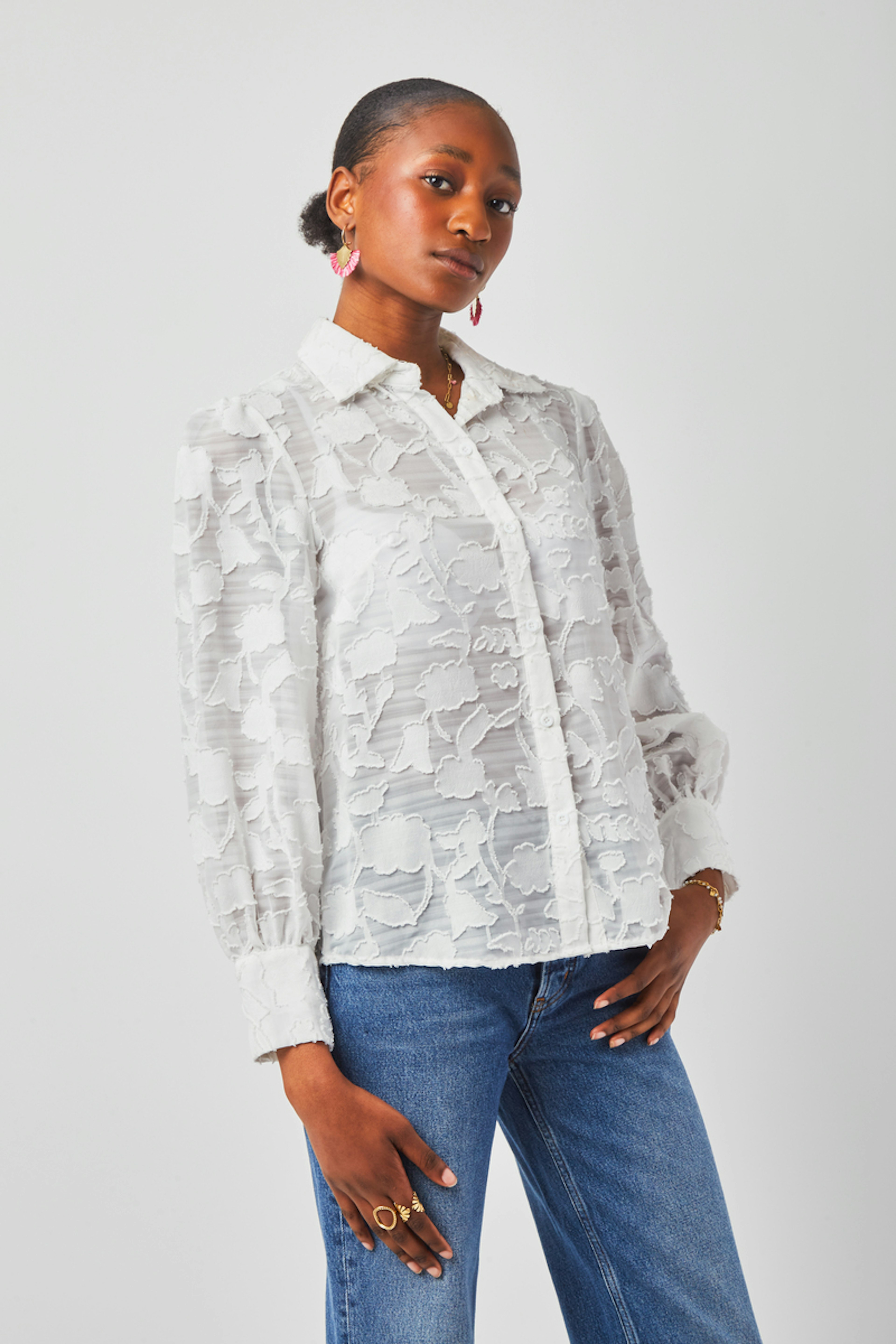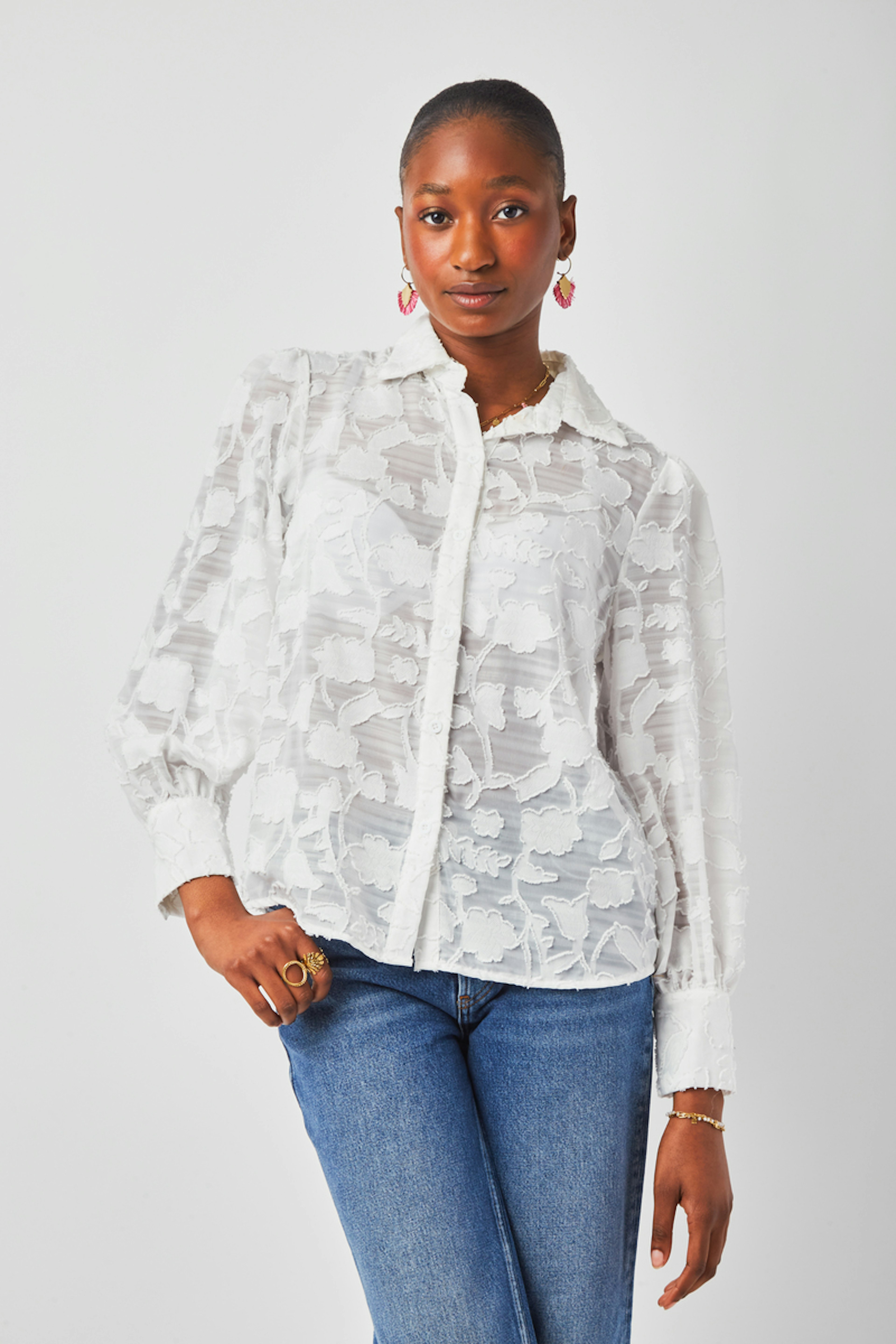 โข Blouse Jeanne โข Motif ร nuages โข Couleur unie โข Dรฉtails en dentelle โข Col chemise โข Manches longues