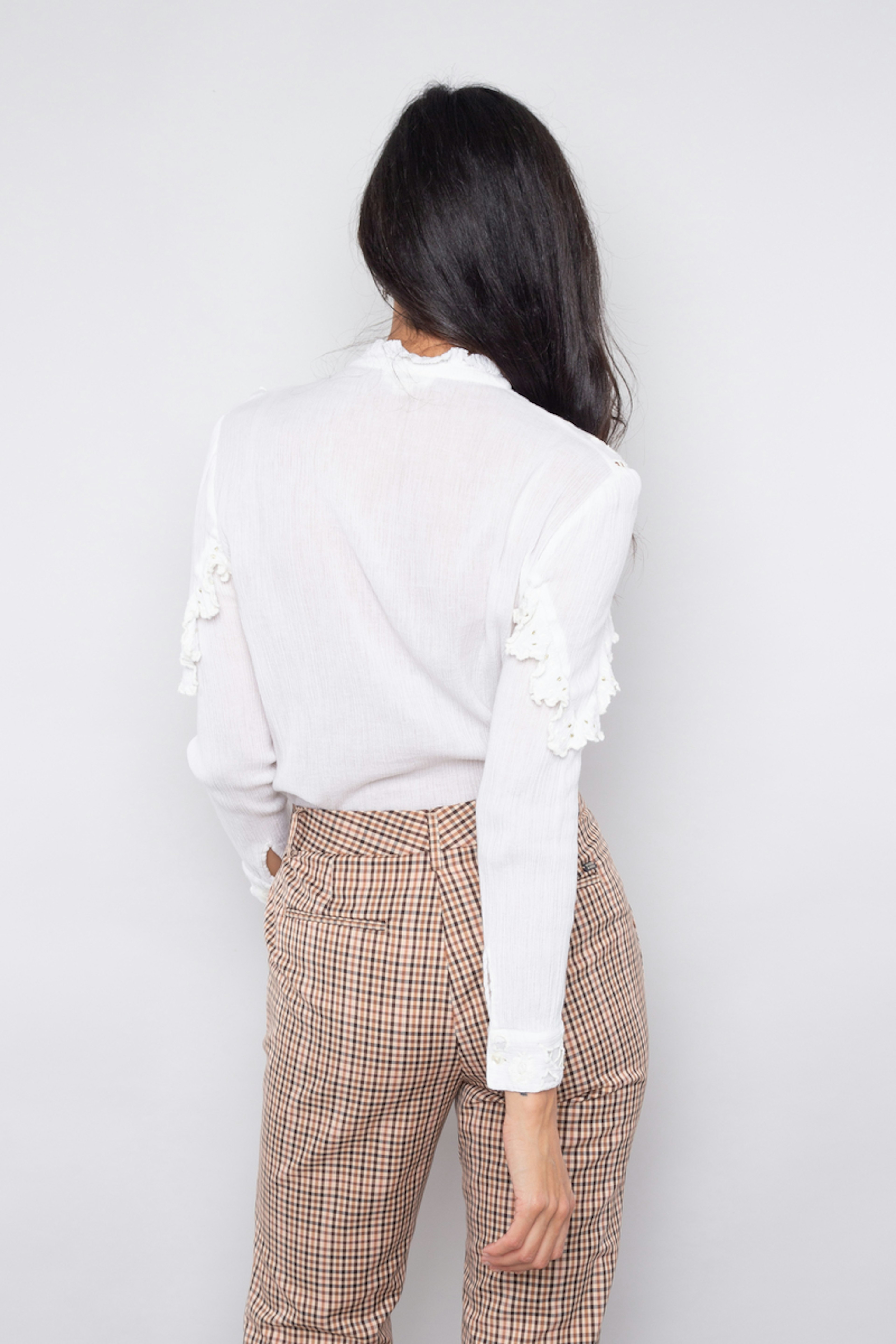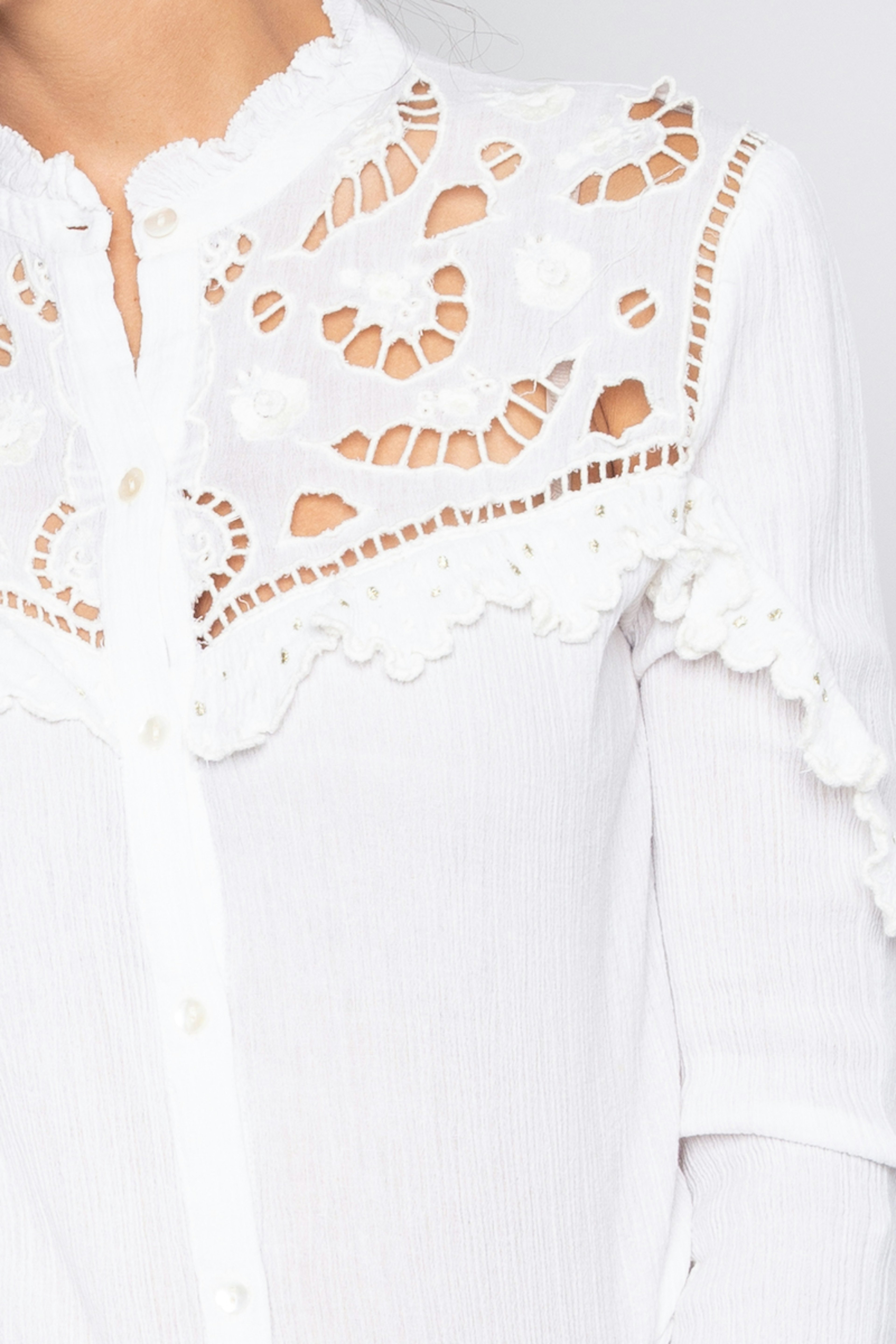 โข Blouse bohรจme chic en coton pour femme โข Col montant avec volant froncรฉ โข Plastron brodรฉ ajourรฉ sur le devant et aux poignets โข Jeu de volants brodรฉs et festonnรฉs sur le devant et sur les manches โข Manches longues et resserrรฉes aux poignets โข Ouverture boutonnรฉe