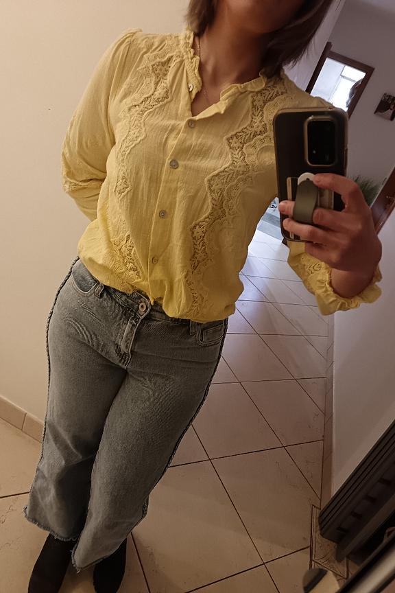 Portez cette blouse en dentelle avec un jean taille haute et des sandales pour un look estival frais et léger. • Blouse à manches longues • Col volanté délicat • Détails en dentelle raffinée • Boutons nacrés élégants • Texture légère et fluide