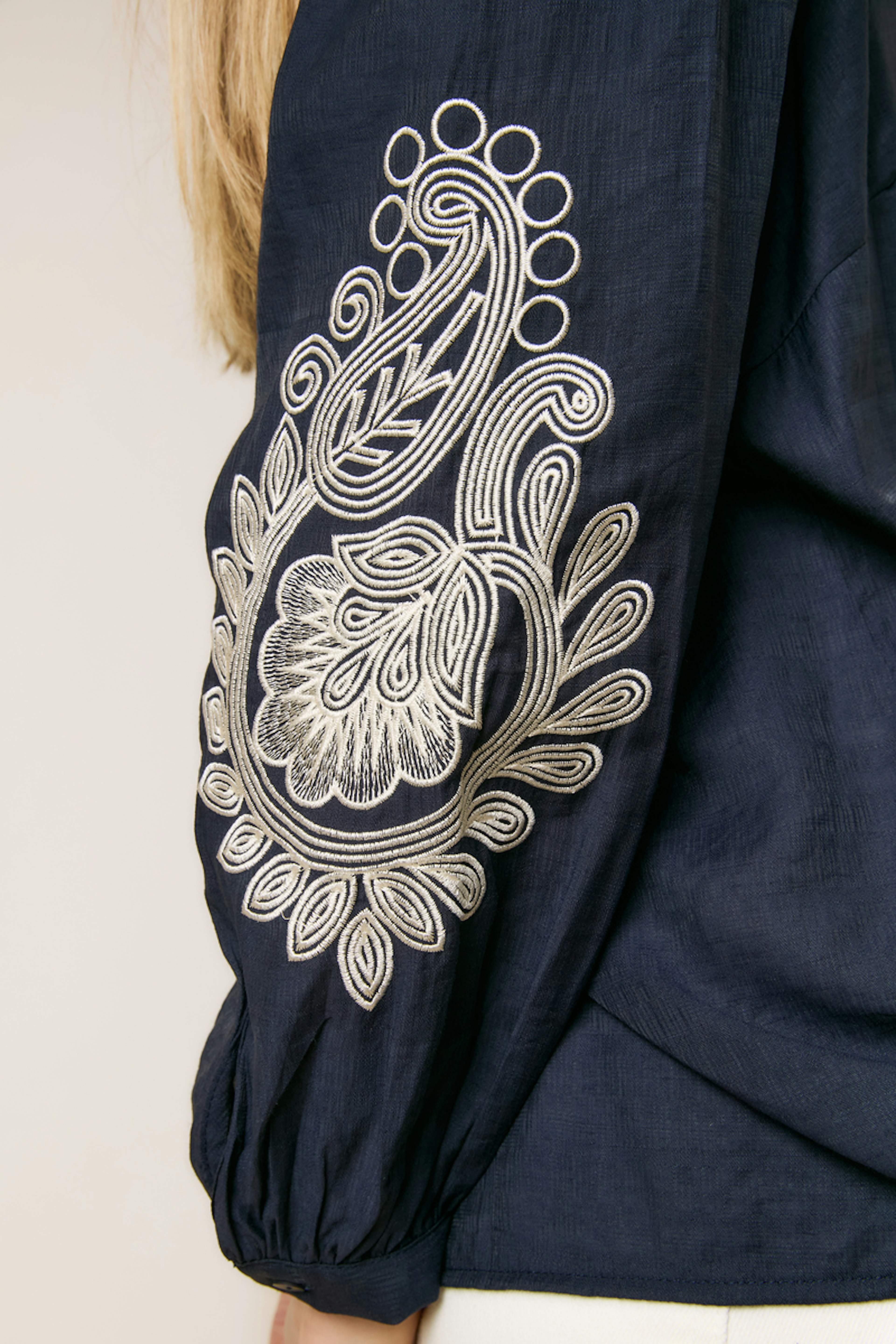 Cette blouse bleu profond se mariera parfaitement avec un pantalon blanc ou une jupe midi pour un look chic. Une pièce idéale pour l'hiver avec un manteau élégant. • Blouse à manches longues • Coupe ample et confortable • Boutonnage partiel devant • Col rond sans revers • Détail brodé sur la manche