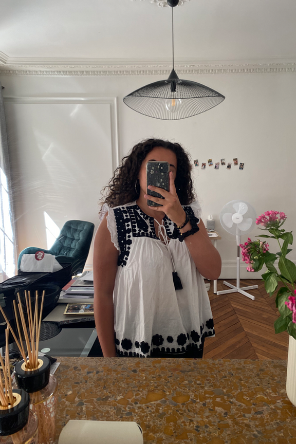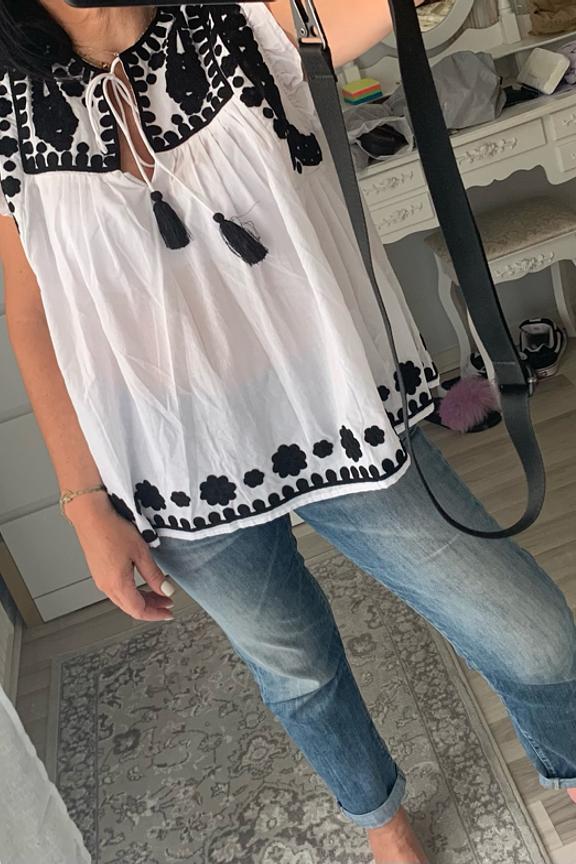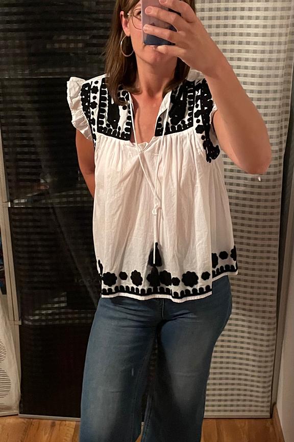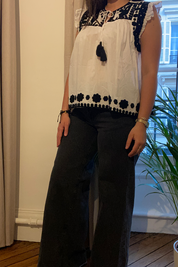 Portez ce haut avec un jean taille haute et des sandales pour une allure estivale et décontractée. Parfait pour toute saison. • Haut en coton • Manches à volants • Col rond avec lien à nouer • Broderies noires • Coupe ample